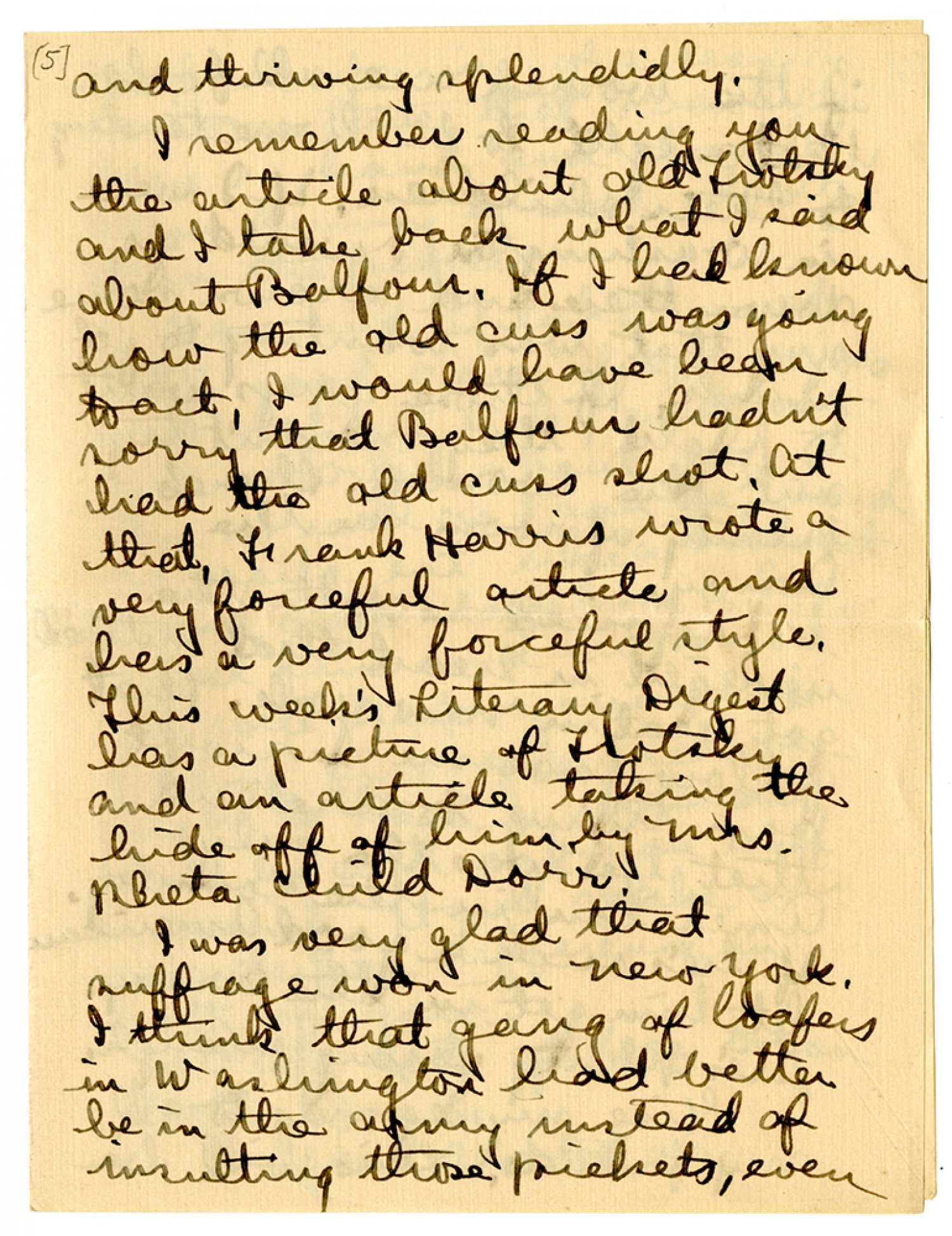 [page 5] and thriving splendidly. I remember reading you the article about old [ms illegible: 1 wd] and I take back what I said about Balfour. If I had known how the old cuss was going to act, I would have been sorry that Balfour hadn’t had the old cuss shot, at that, Frank Harris wrote a very forceful article and has a very forceful style. This week’s Literary Digest has a picture of [ms illegible: 1 wd] and an article taking the hide out of him by Mrs. [ms illegible: 1 wd] Child Dorr. I was very glad that suffrage won in New York. I think that gang of loafers in Washington had better be in the army instead of insulting those pickets, even