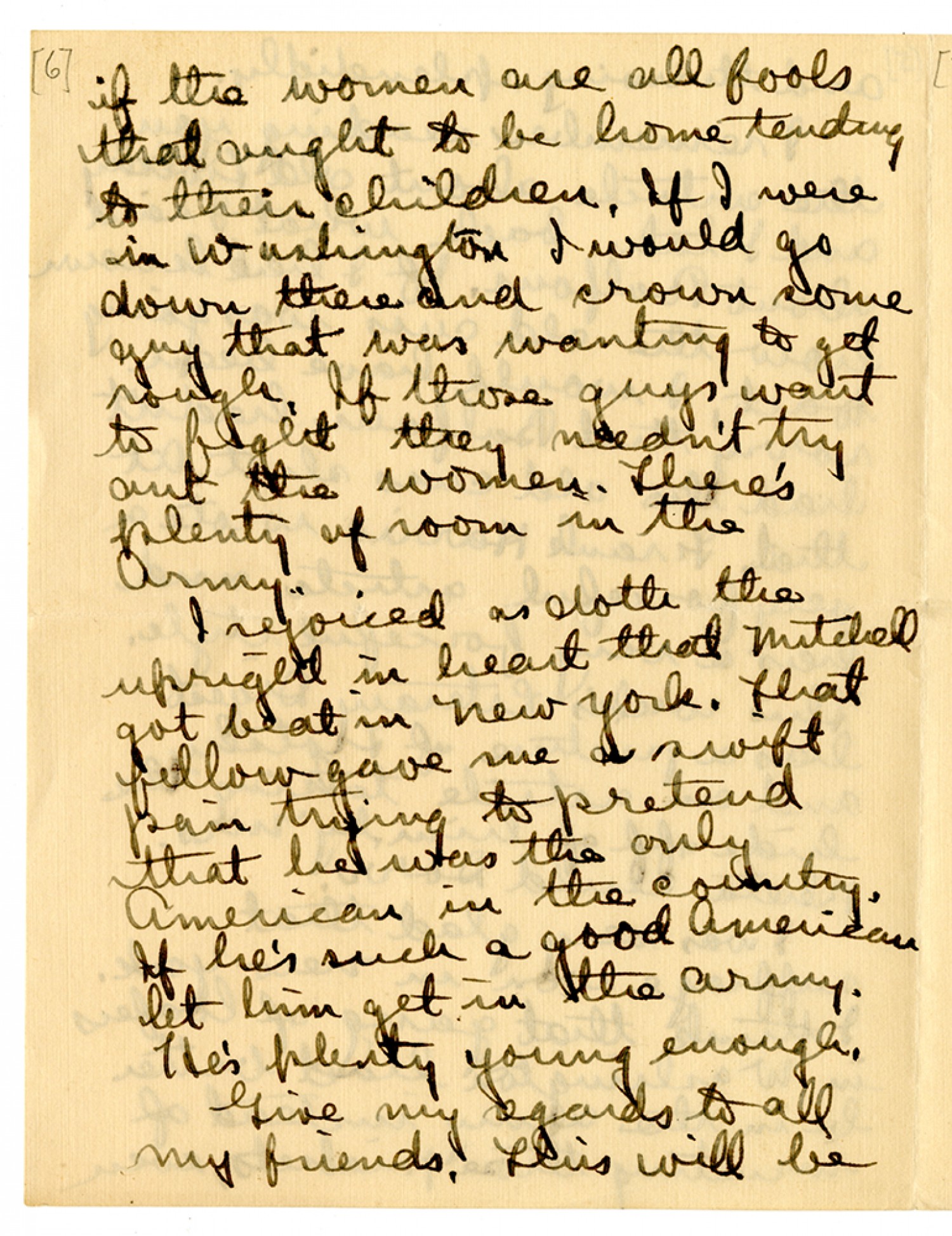[page 6] if the women are all fools that ought to be home tending to their children. If I were in Washington I would go down there and crown some guy that was wanting to get rough, If those guys want to fight they needn’t try out the women. There’s plenty of room in the Army. I rejoiced as [ms illegible: 1 wd] the upright in heart that Mitchell got beat in New York. That fellow gave me a swift pain trying to pretend that he was the only American in the country. If he’s such a good American let him get in the Army. He’s plenty young enough. Give my regards to all my friends. This will be