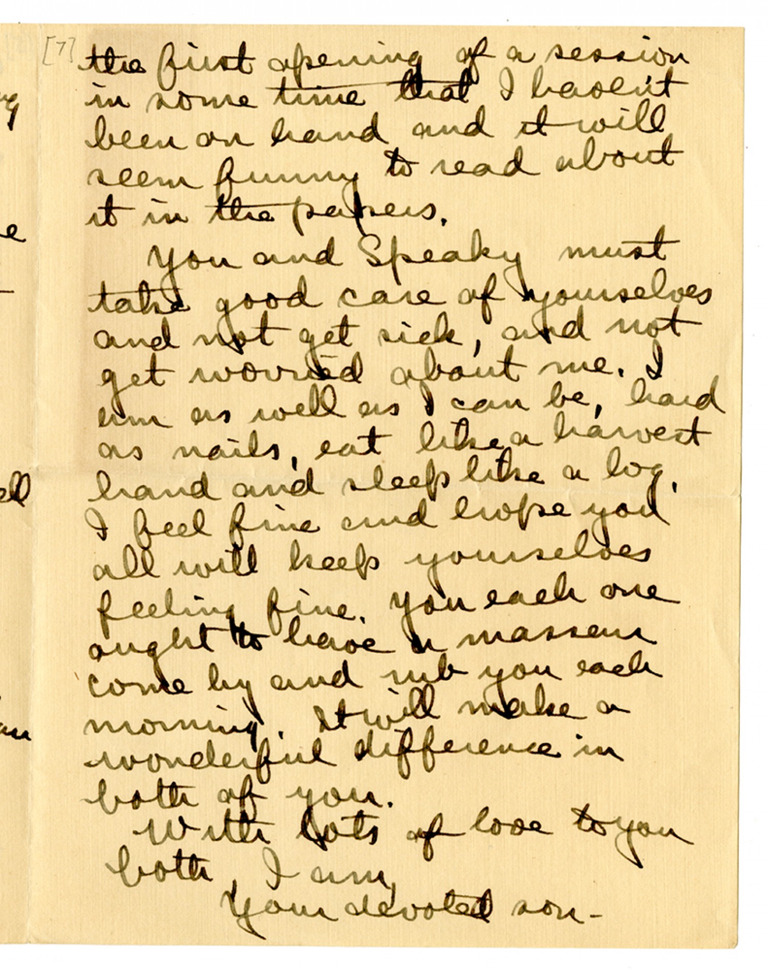 [page 7] the first opening of a session in some time that I haven’t been on hand it will seem funny to read about it in the papers. You and Speaky must take good care of yourselves and not get sick, and not get worried about me. I am as well as can be, hard as nails, eat like a harvest band and sleep like a log. I feel fine and hope you all will keep yourselves feeling fine. You each one ought to have a masseur come by and rub you each morning. It will make a wonderful difference in both of you. With lots of love to you both, I am your devoted son.