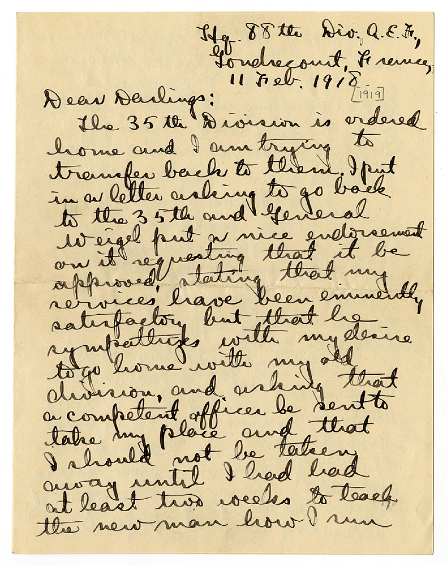 Hq. [88th Division] A.E.F., Gondrecourt, France 11 [February] 1918. Dear Darlings: The 35 Division is ordered home and I am trying to transfer back to them. I put in a letter asking to go back to the 35th and General Weigel put a nice endorsement on it requesting that it be approved, stating that my services have been eminently satisfactory but that he sympathizes with my desire to go home with my old division, and asking that a competent officer be sent to take my place and that I should not be taken away until I had had at least two weeks to teach the new man how I run