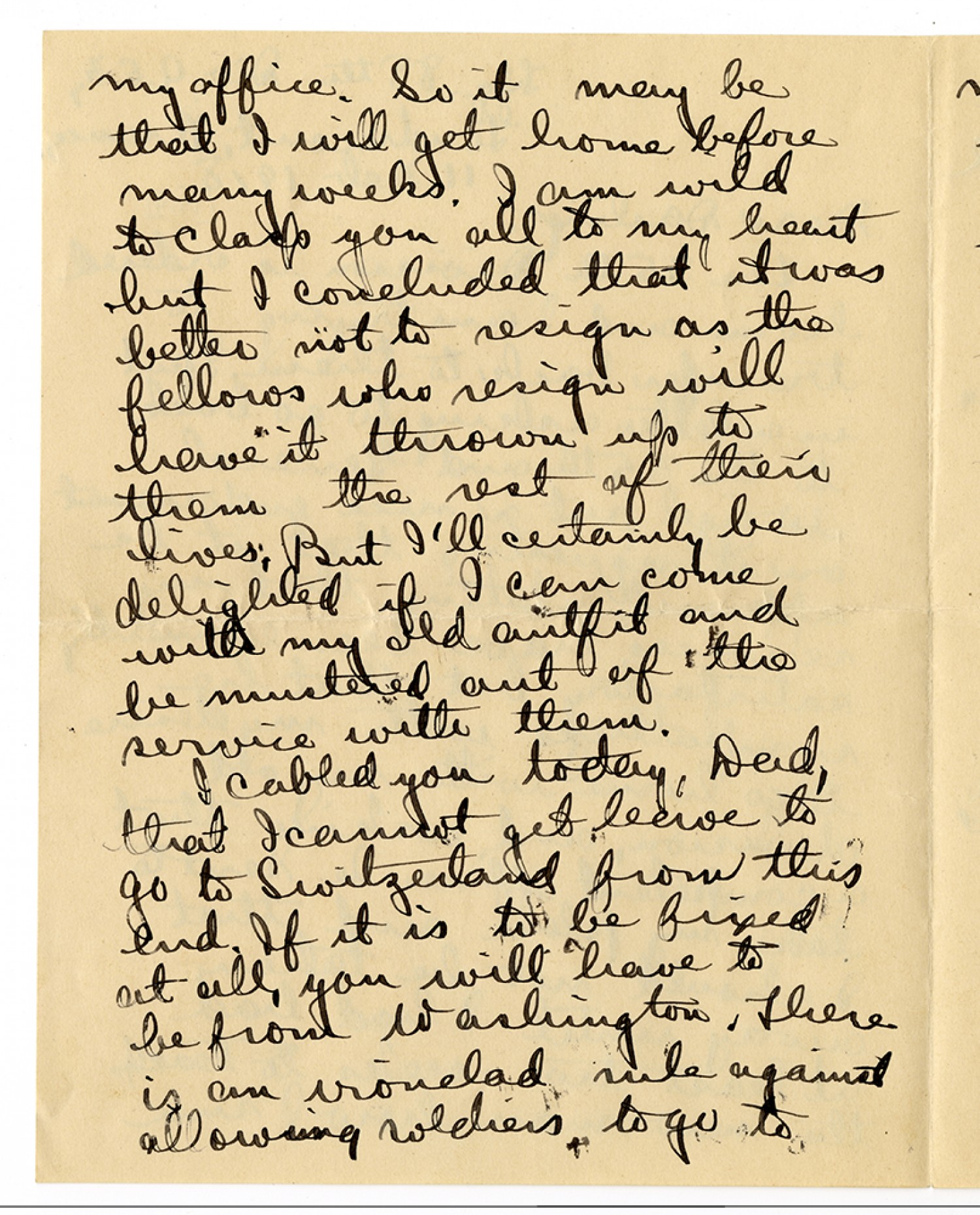 my office. So it may be that I will get home before many weeks. I am wild to clasp you all to my heart but I concluded that it was better not to resign as the fellows who resign will have it thrown up to them the rest of their lives. But I’ll certainly be delighted if I can come with my old outfit and be mustered out of the service with them. I cabled you today, Dad, that I cannot get leave to go to Switzerland from this end. If it is to be fixed at all, you will have to be from Washington. There is an ironclad rule against allowing soldiers to go to