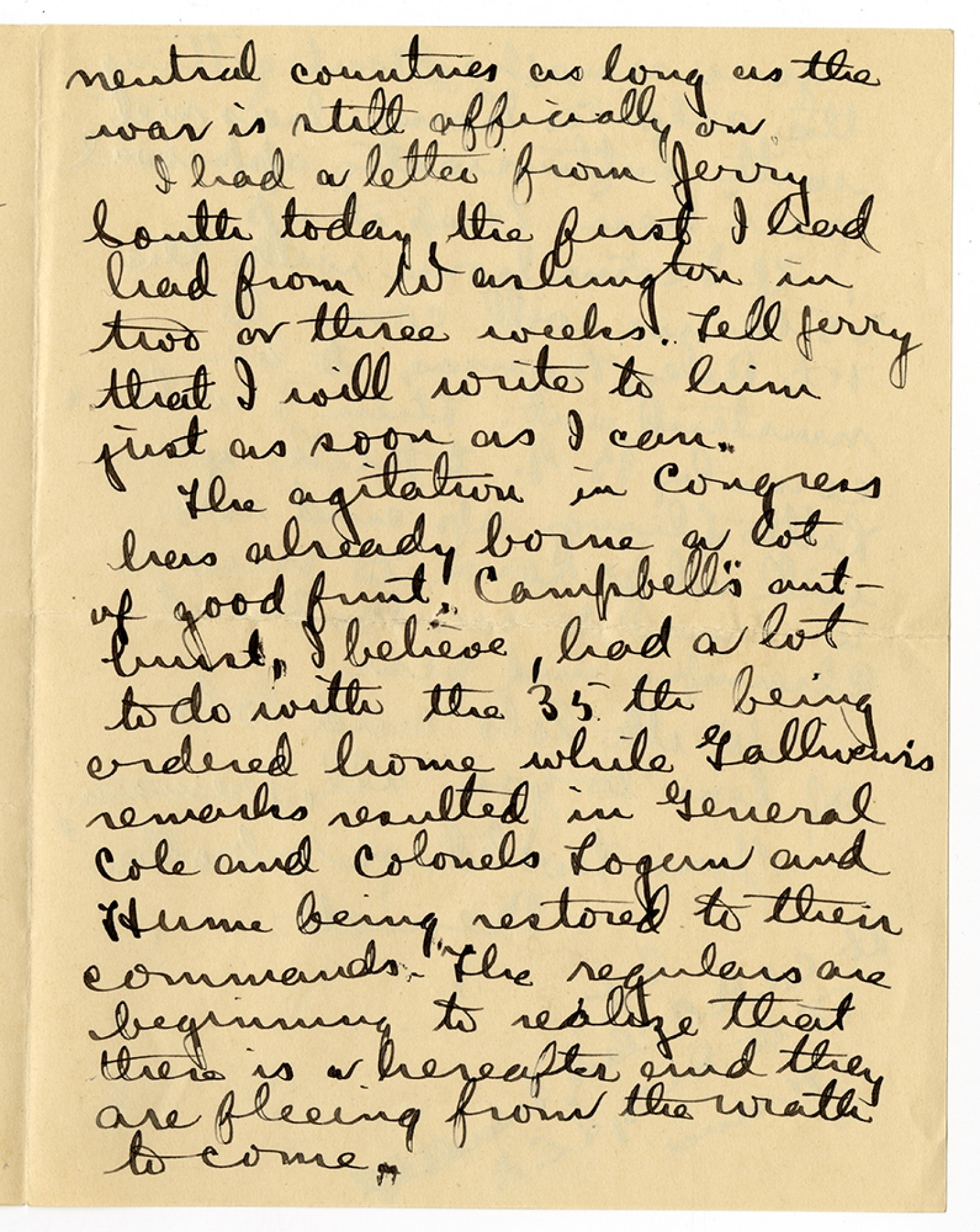 neutral countries as long as the war is still officially on I had a letter from Jerry South today, the first I had had from Washington in two or three weeks. Tell Jerry that I will write to him just as soon as I can. The agitation in Congress has already borne a lot of good print. Campbell’s outburst, I believe, had a lot to do with the 35th being ordered home while Galliveur’s remarks resulted in General Cole and Colonels Logan and Hume being restored to their commands. The regulars are beginning to realize that there is a hereafter and they are fleeing from the wrath to come.