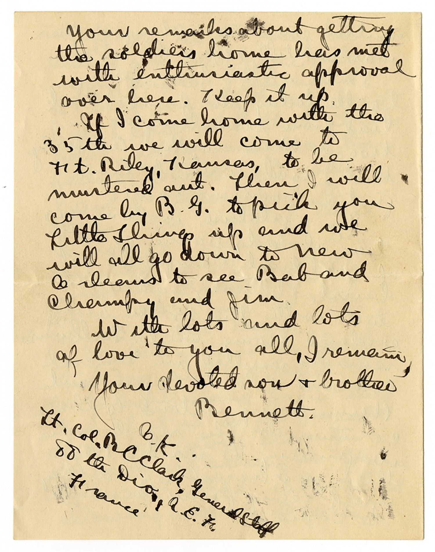 Your remarks about getting the soldiers home has met with enthusiastic approval over here. Keep it up. If I come home with the 35th we will come to [Fort Riley], Kansas, to be mustered out. Then I will come by B.G. to pick you Little things up and we will all go down to New Orleans to see Bob and Champy and Jim. With lots and lots of love to you all, I remain, Your devoted son & brother Bennett. [censor’s signature] Lt. Col. BCClark Jeneral Staff 88th Div. A.E.F. France