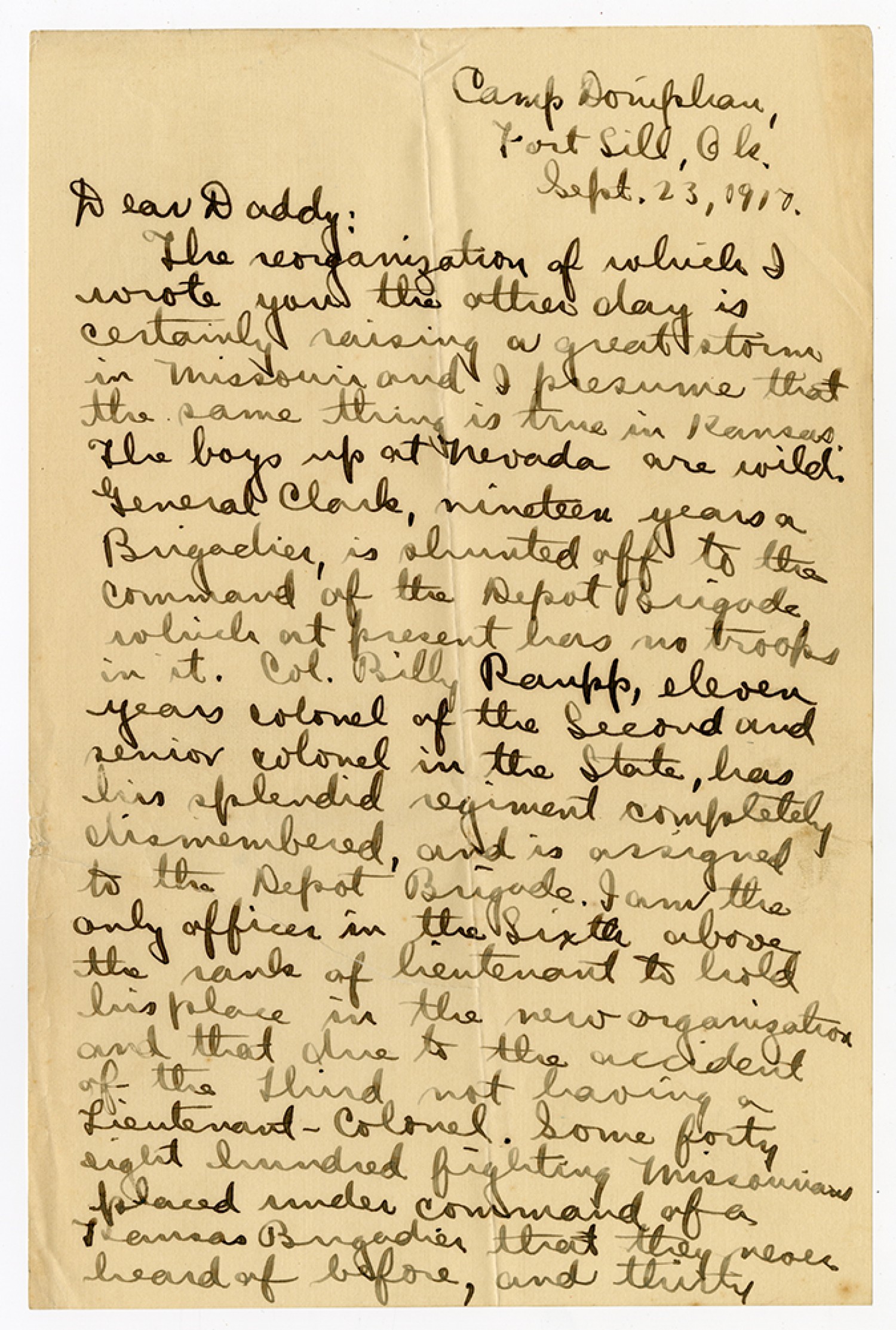Camp Doniphan, Fort Sill, [Oklahoma] [September] 23, 1917. Dear Daddy: The reorganization of which I wrote you the other day is certainly raising a great storm in Missouri and I presume that the same thing is true in Kansas. The boys up at Nevada [Missouri] are wild. General Clark, nineteen years a Brigadier, is shunted off to the Command of the Depot Brigade which at present has no troops in it. Col. Billy Raupp, eleven years colonel of the Second and senior colonel in the State, has his splendid regiment completely dismembered, and is assigned to the Depot Brigade. I am the only officer in the Sixth above the rank of Lieutenant to hold his place in the new organization and that due to the accident of the Third not having a Lieutenant – Colonel. Some forty eight hundred fighting Missourians placed under command of a Kansas Brigadier that they never heard of before, and thirty
