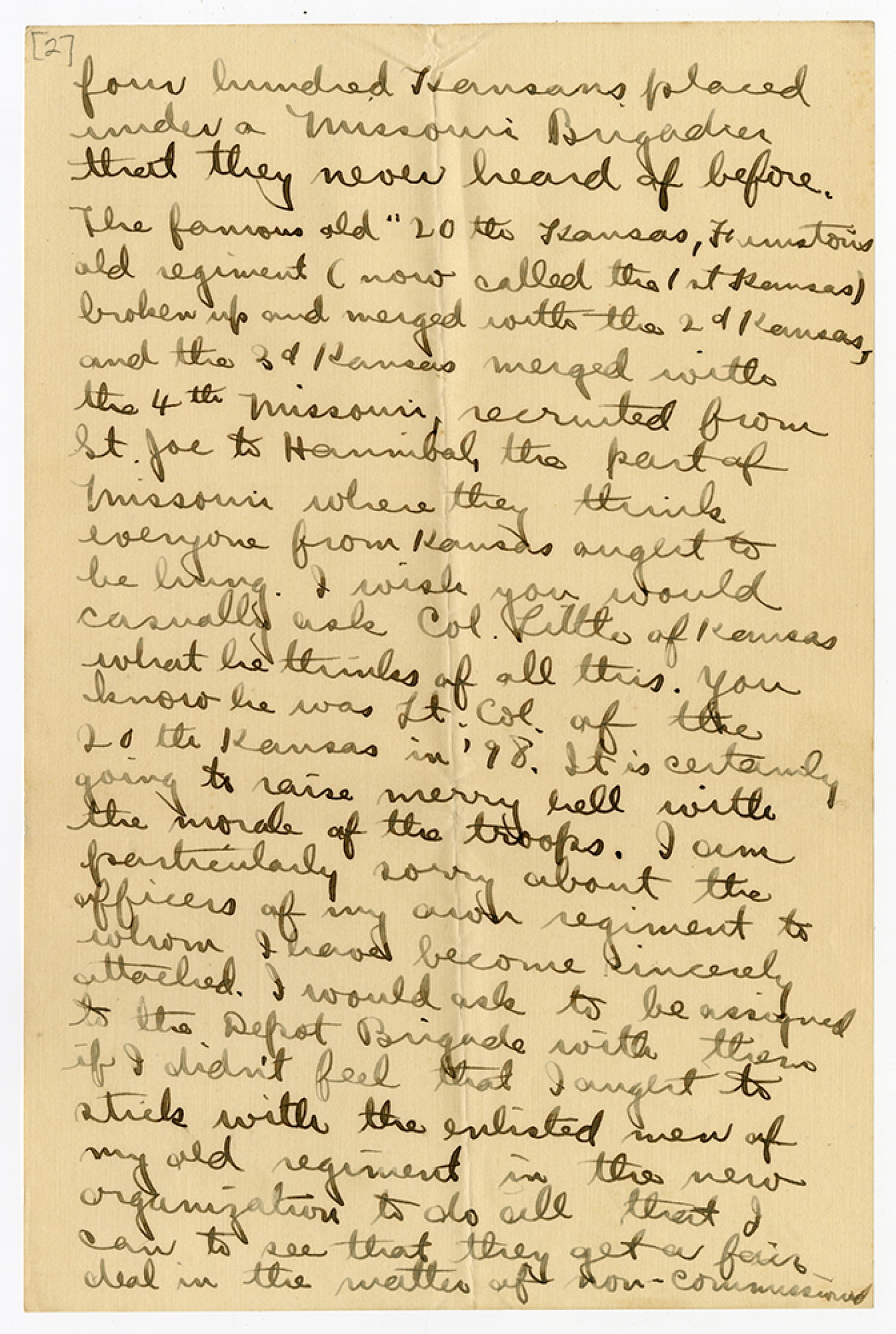 [page 2] four hundred Kansans placed under a Missouri Brigadier that they never heard of before. The famous old “20th Kansas, Funston’s old regiment (now called the 1st Kansas) broken up and merged with the 2d Kansas, and the 3d Kansas merged with the 4th Missouri, recruited from St. Joe to Hannibal, the part of Missouri where they think everyone from Kansas ought to be brung. I wish you would casually ask Col. Little of Kansas what he thinks of all this. You know he was Lt. Col. of the 20th Kansas in [1898]. It is certainly going to raise merry hell with the morale of the troops. I am particularly sorry about the officers of my own regiment to whom I have become attached. I would ask to be assigned to the Depot Brigade with them if I didn’t feel that I ought to stick with the enlisted men of my old regiment in the new organization to do all that I can to see that they get a fair deal in the matters of non-commissioned