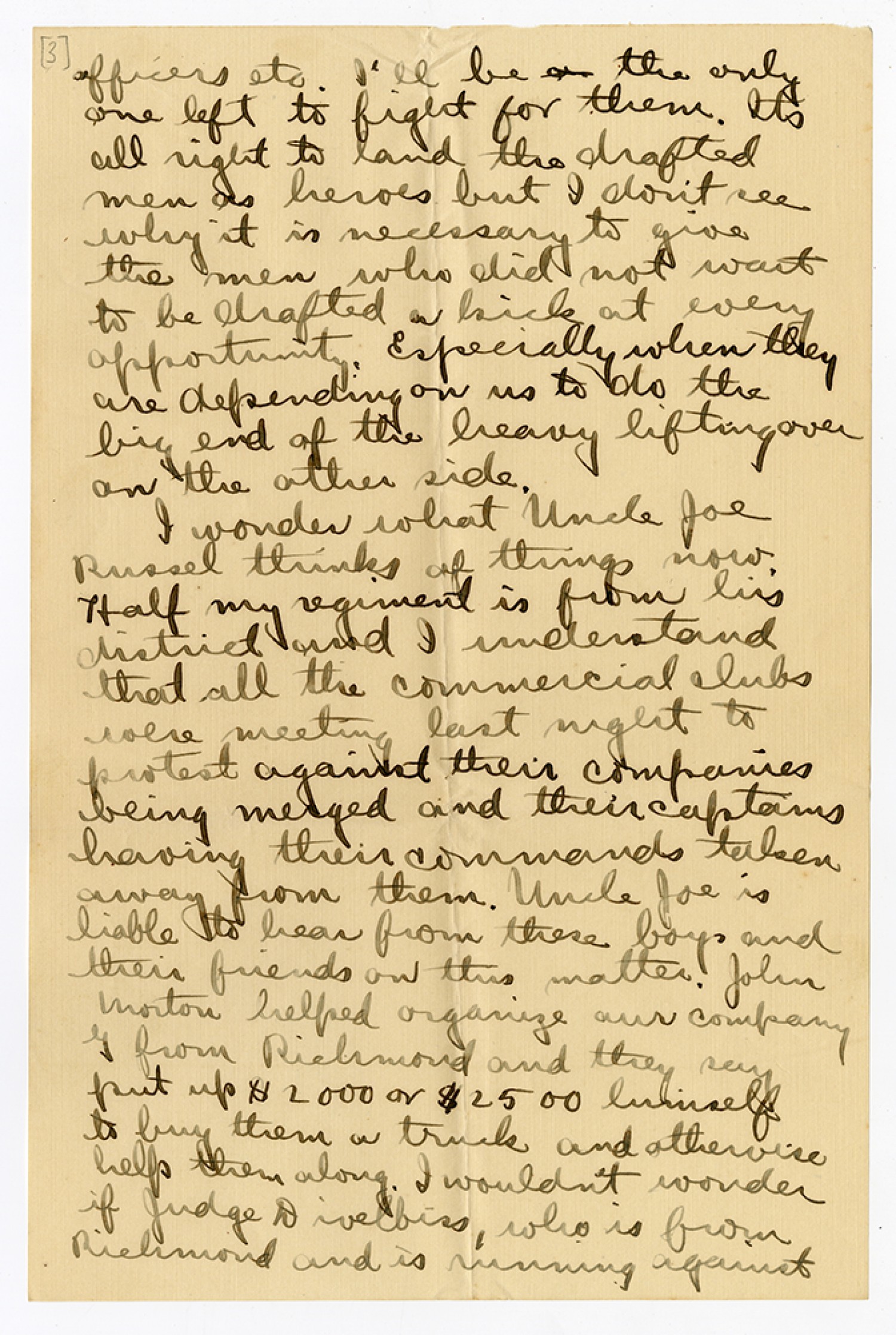 [page 3] officers etc. I’ll be the only one left to fight for them. Its all right to laud the drafted men as heroes but I don’t see why it is necessary to give the men who did not wait to be drafted a kick at every opportunity. Especially when they are depending on us to do the big end of the heavy lifting over on the other side. I wonder what Uncle Joe Russel thinks of things now Half my regiment is from his district and I understand that all the commercial clubs were meeting last night to protest against their companies being merged and their captains having their commands taken away from them. Uncle Joe is liable to hear from these boys and their friends on this matter. John Morton helped organize our company G from Richmond and they say put up $2000 or $2500 himself to buy them a truck and otherwise help them along. I wouldn’t wonder if judge Divelbiss, who is from Richmond and is running against