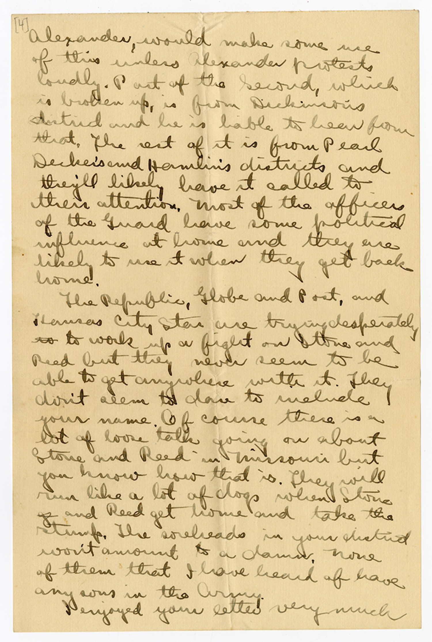 [page 4] Alexander, would make some use of this unless Alexander protests loudly. Part of the Second, which is broken up, is from Dickinsons district and he is liable to been from that. The rest of it is from Pearl Dicker’s and Hamlins districts and they’ll likely have it called to their attention. Most of the officers of the Guard have some political influence at home and they are likely to use it when they get back home. The Republic, Globe and post, and Kansas City Star are trying desperately to work up a fight on Stone and Reed but they never seem to be able to get anywhere with it. They don’t seem to dare to include your name. Of course there is a lot of loose talk going on about Stone and Reed in Missouri but you know how that is. They will run like a lot of dogs when stone and Reed get home and take the stump. The soreheads in your district won’t amount to a damn. None of them that I have heard of have any sons in the Army. I enjoyed your letter very much