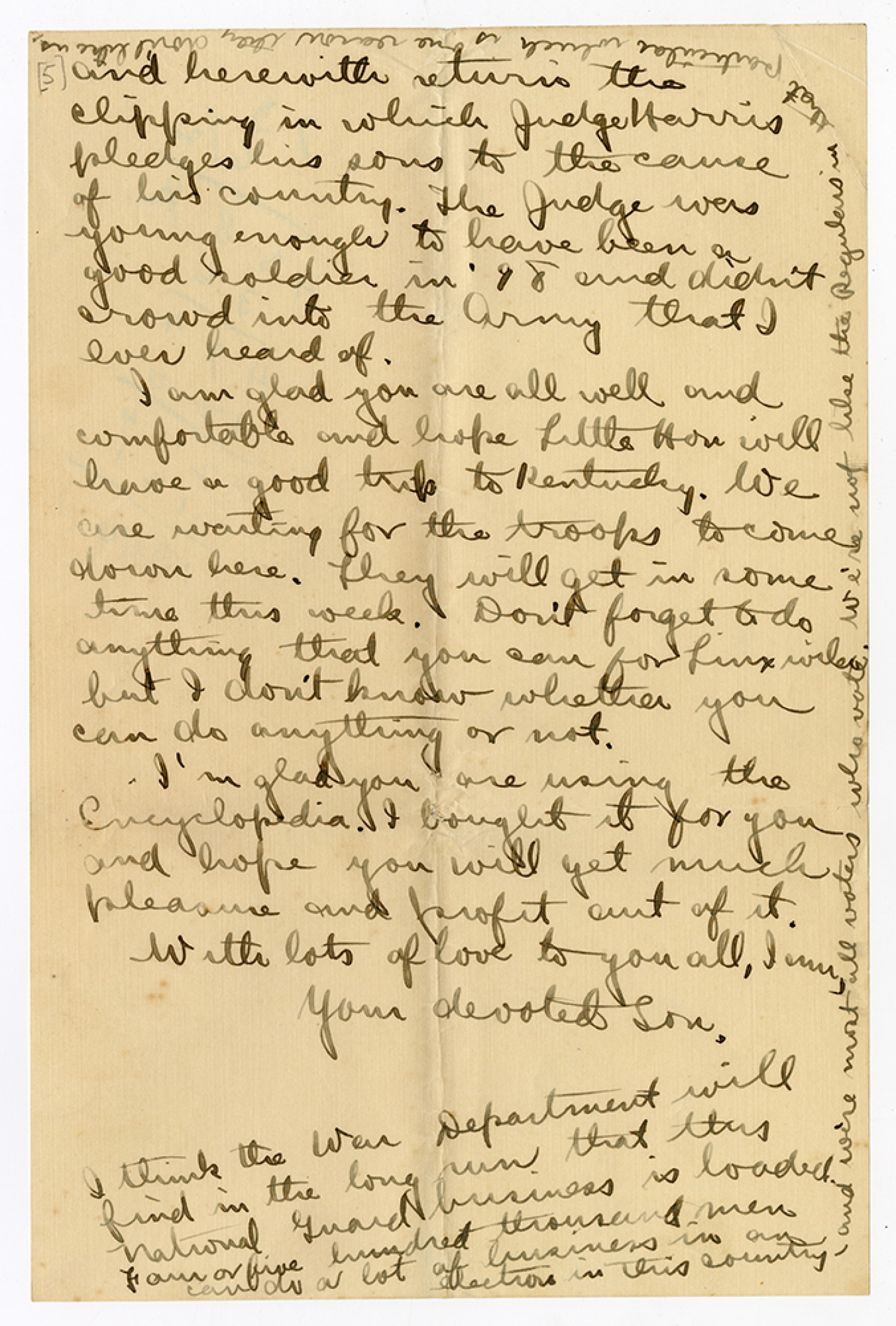 [page 5] and herewith returns the clipping in which judge Harris pledges his sons to the cause of his country. The Judge was young enough to have been a good soldier in [1898] and didn’t crowd into the Army that I ever heard of. I am glad you are all well and comfortable and hope Little Hon will have a good trip to Kentucky. We are waiting for the troops to come down here. They will get in some time this week. Don’t forget to do anything that you can for Linxwiler but I don’t know whether you can do anything or not. I’m glad you are using the Encyclopedia. I bought it for you and hope you will get much pleasure and profit out of it. With lots of love to you all, I am your devoted Son, I think the War Department will find in the long run that this National Guard business is loaded. Four or five thousand men can do a lot of business in an election in this country [written in the right margin] and were most all voters who vote we’re not like the Regulars in that particular which is one reason they don’t like us,
