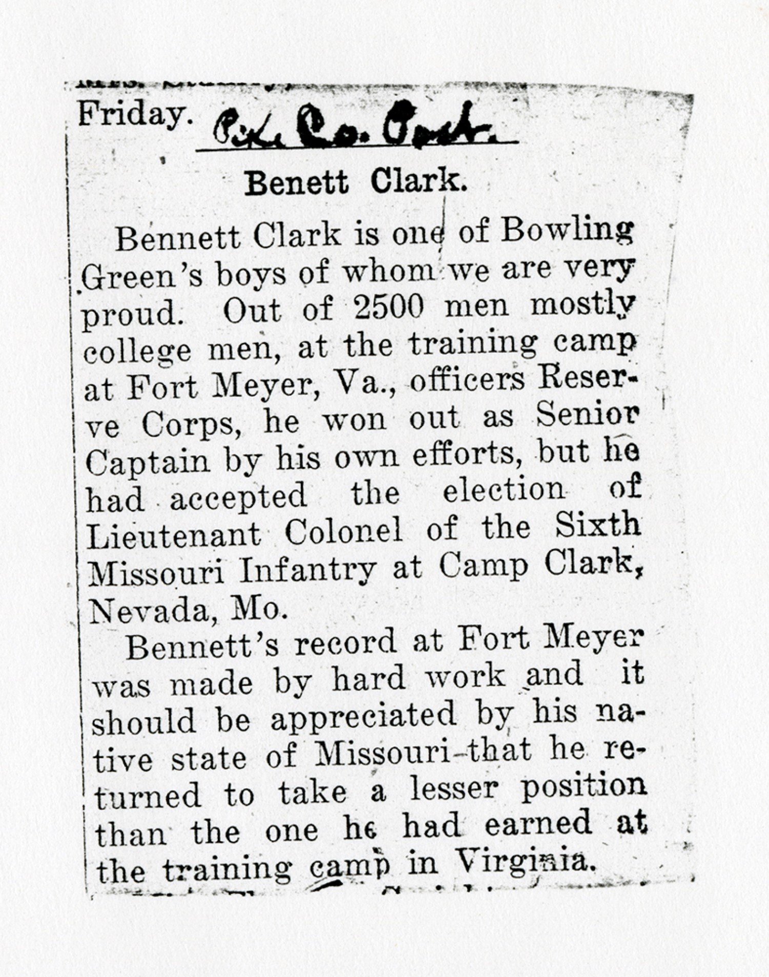 | Description | In this September 23, 1917, letter to Champ Clark, Bennett Clark discussed the reorganization of the Missouri National Guard into the U.S. Army. Enclosed with the letter is a newspaper clipping about Bennett's service. Champ Clark, a long-time resident of Bowling Green, Missouri, was a politician in the Democratic Party. He served as a representative of Missouri from 1893 to 1895 and from 1897 to 1921. From 1911 to 1919 he served as the Speaker of the United States House of Representatives. Bennett Clark served as a colonel in the Army during World War I, and in 1932 was elected as a State Senator. |