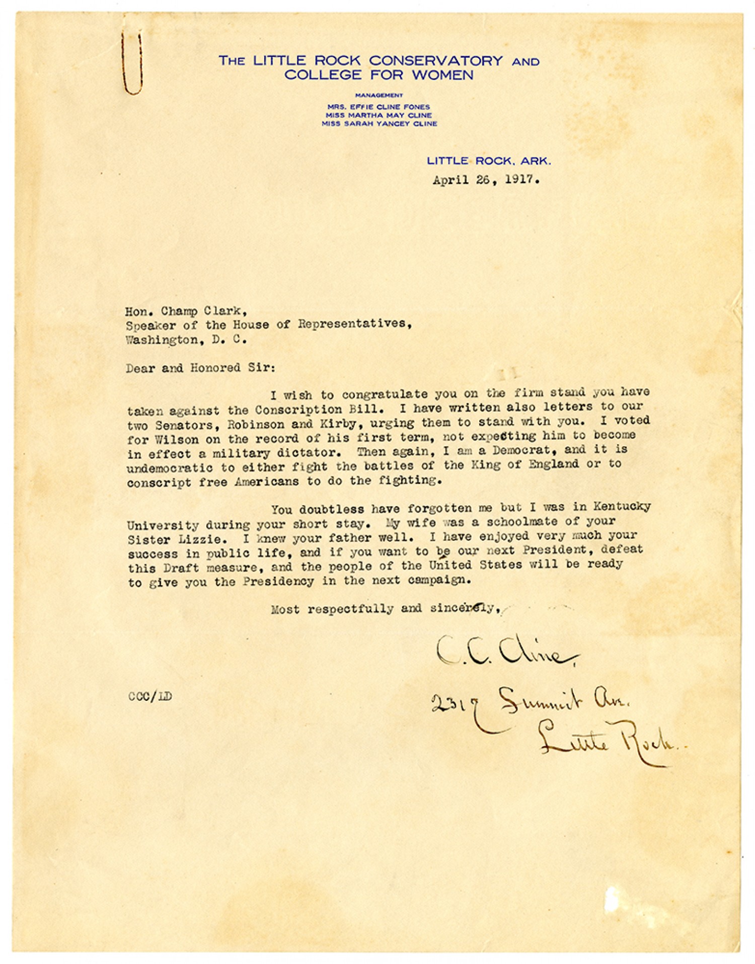 LITTLE ROCK [Arkansas] April 26, 1917. Hon. Champ Clark, Speaker of the House of Representatives, Washington, D.C. Dear Honored Sir: I wish to congratulate you on the firm stand you have taken against the Conscription Bill. I have written also letters to our two senators, Robinson and Kirby, urging them to stand with you. I voted for [Woodrow] Wilson on the record of his first term, not expecting him to become in effect a military dictator. Then again, I am a Democrat, and it is undemocratic to either fight the battles of the King of England or to conscript free Americans to the fighting. You doubtless have forgotten me but I was in Kentucky University during your short stay. My wife was a schoolmate of your Sister Lizzie. I knew your father well. I have enjoyed very much your success in public life, and if you want to be our next President, defeat this Draft measure, and the people of the United States will be ready to give you the Presidency in the next campaign. Most respectfully and sincerley, C.C. Cline 2317 Summit Ave Little Rock CCC/LD