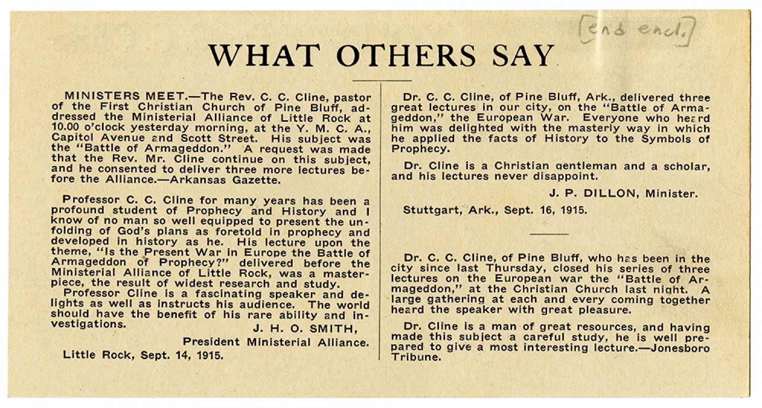 | Source | Cline, C.C. Letter to Champ Clark. 26 April 1917. Clark, Champ (1850-1921) and Bennett Champ (1890-1954), Papers, 1853-1973. C0666. The State Historical Society of Missouri, Columbia, MO. |