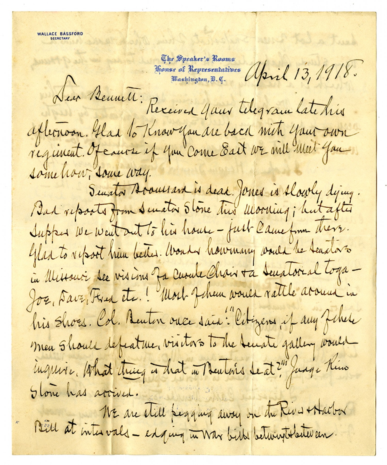 April 13, 1918. Dear Bennett: Received your telegram late this afternoon. Glad to know you are back with your own regiment. Of course if you come East we will meet you some how, some way. Senator Broussard is dead. Jones is slowly dying. Bad reports from Senator Stone this morning ; but after Supper we went out to his house – just came from there. Glad to report him better. Wonder how many would be Senators in Missouri see visions of a cuole chair & a Senatorial toga – Joe, Dave, Fred etc.! Most of them would rattle around in his shoes. Col Beuton once said: “Citizens, if any of these men should defeat me, visitors to the Senate gallery would inquire, What thing is that in Newton’s Seat?” Judge Rim Stone has arrived. We are still pegging away on the Rivera and Harbor Bill at intervals- edging in War bills betwixt & between.