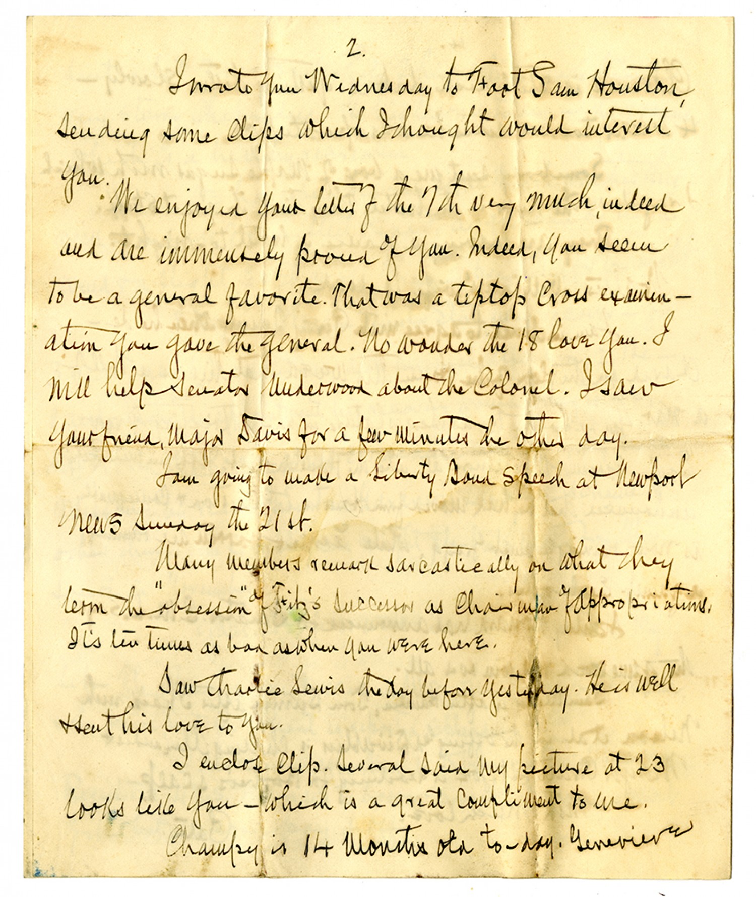 [page 2] I wrote you Wednesday to Fort Sam Houston, sending some clips which I thought would interest you. We enjoyed your letter of the 7th very much indeed and are immensely proud of you. Indeed, you seem to be a general favorite. That was a tiptop cross examination you gave the general. No wonder the 18 love you. I saw your friend, Major Davis for a few minutes the other day. I am going to make a Liberty Bond Speech at Newport News Sunday the 21st. Many members remark sarcastically on what they term the “obsession” of Fitz’s success as Chairman of Appropriations. It’s ten times as bad as when you were here. Saw Charles Lewis the day before yesterday. He is well and sent his love to you. I enclose clip. Several said my picture at 23 looks like you – which is a great compliment to me. Champy is 14 months old to-day. Genevieve