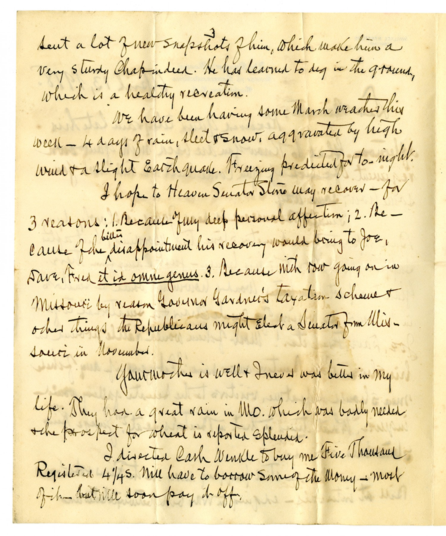 [page 3] Sent a lot of new snapshots of him, which make him a very sturdy chap indeed. He has learned to dig in the ground, which is a healthy recreation. We have been having some March weather this week – 4 days of rain, sleet and snow, aggravated by high wind and a slight Earth quake. Freeing predicted for to-night. I hope to heaven Senator Stone may recover – for 3 reasons: 1. Because of my deep personal affection; 2. Because of the bitter disappointment his recovery would bring to Joe Dave, Fred it is omnigenus. 3. Because with row going on in Missouri by reason Governor Gardner’s taxation scheme and other things the Republicans might Elect a Senator from Missouri in November. Your mother is well and I never was better in My life. They had a great rain in [Missouri] which was badly needed and the prospect for wheat is reported splendid. I directed Cash Winkle to buy me Five Thousand Registered 4/4’s. Will have to borrow Some of the Money – Most of it – but will soon pay it off.