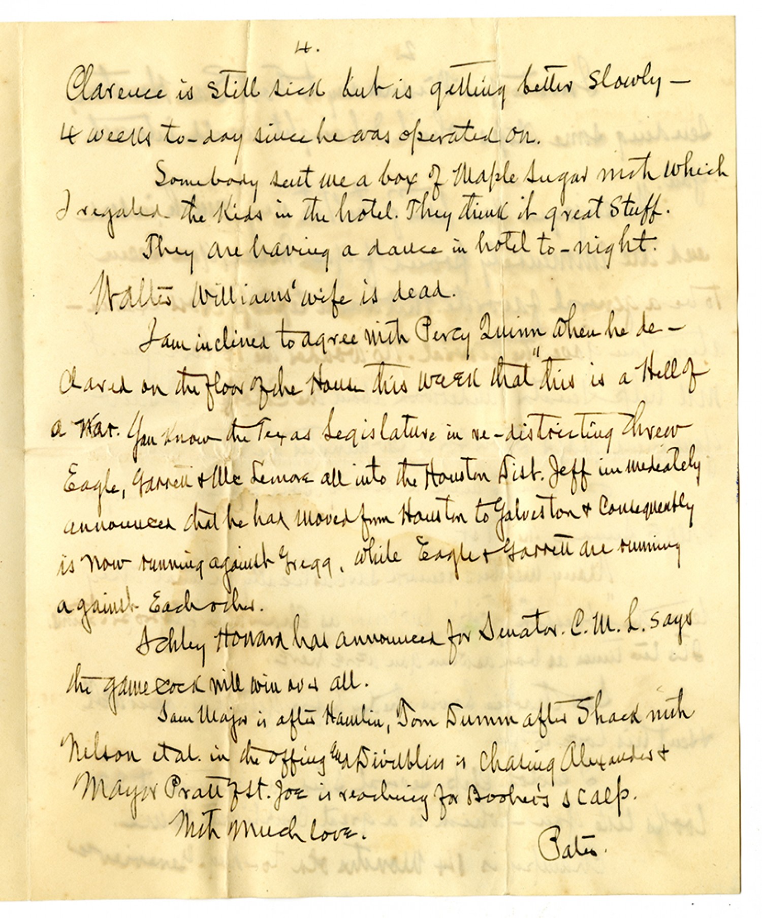 [page 4] Clarence is still sick but is getting better slowly – 4 weeks to-day since he was operated on. Somebody sent me a box of Maple Sugar with which I regaled the kids in the hotel. They think it great stuff. They are having a dance in hotel to –night. Walter Williams’ wife is dead. I am inclined to agree with Percy Quinn when he declared on the floor of the House this week that “this is a Hell of a War. You know the Texas Legislature in re-districting threw Eagle, Garrett and McLemore all into the House on Dist. Jeff immediately announces that he had moved from Houston to Galveston and Consequently is now running against Gregg. While Eagle and Garrett are running against Each other. Ashley Howard has announces for Senator C.M.L. says the game will win over all. Sam Major is after Hamlin, Tom Dumm after Shack with Nelson et al. in the offing and [ms illegible: 1 wd] is chasing Alexander and Major Pratt of [St. Joseph, Missouri] is reaching for Booker’s scalp. With much love. Pater.