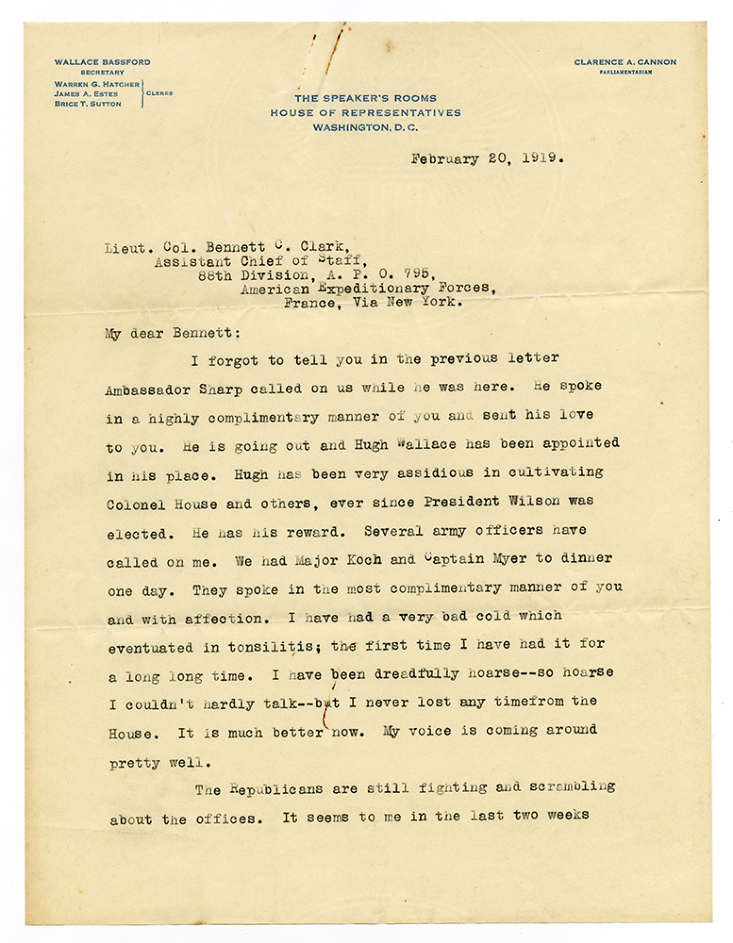 February 20, 1919. Lieut. Col. Bennett C. Clark, Assistant Chief of Staff, 88th Division, A. P. O. 795, American Expeditionary Forces, France, Via New York. My dear Bennett: I forgot to tell you in the previous letter Ambassador Sharp called on us while he was here. He spoke in a highly complimentary manner of you and sent his love to you. He is going out and Hugh Wallace has been appointed in his place. Hugh has been very assidious in cultivating Colonel House and others, ever since President [Woodrow] Wilson was elected. He has his reward. Several army officers have called on me. We had Major Koch and Captain Myer to dinner one day. They spoke in the most complimentary manner of you and with affection. I have had a very bad cold which eventuated in tonsilitis; the first time I have had it for a long long time. I have been dreadfully hoarse--so hoarse I couldn’t hardly talk--but I never lost any time from the House. It is much better now. My voice is coming around pretty well. The Republicans are still fighting and scrambling about the offices. It seems to me in the last two weeks