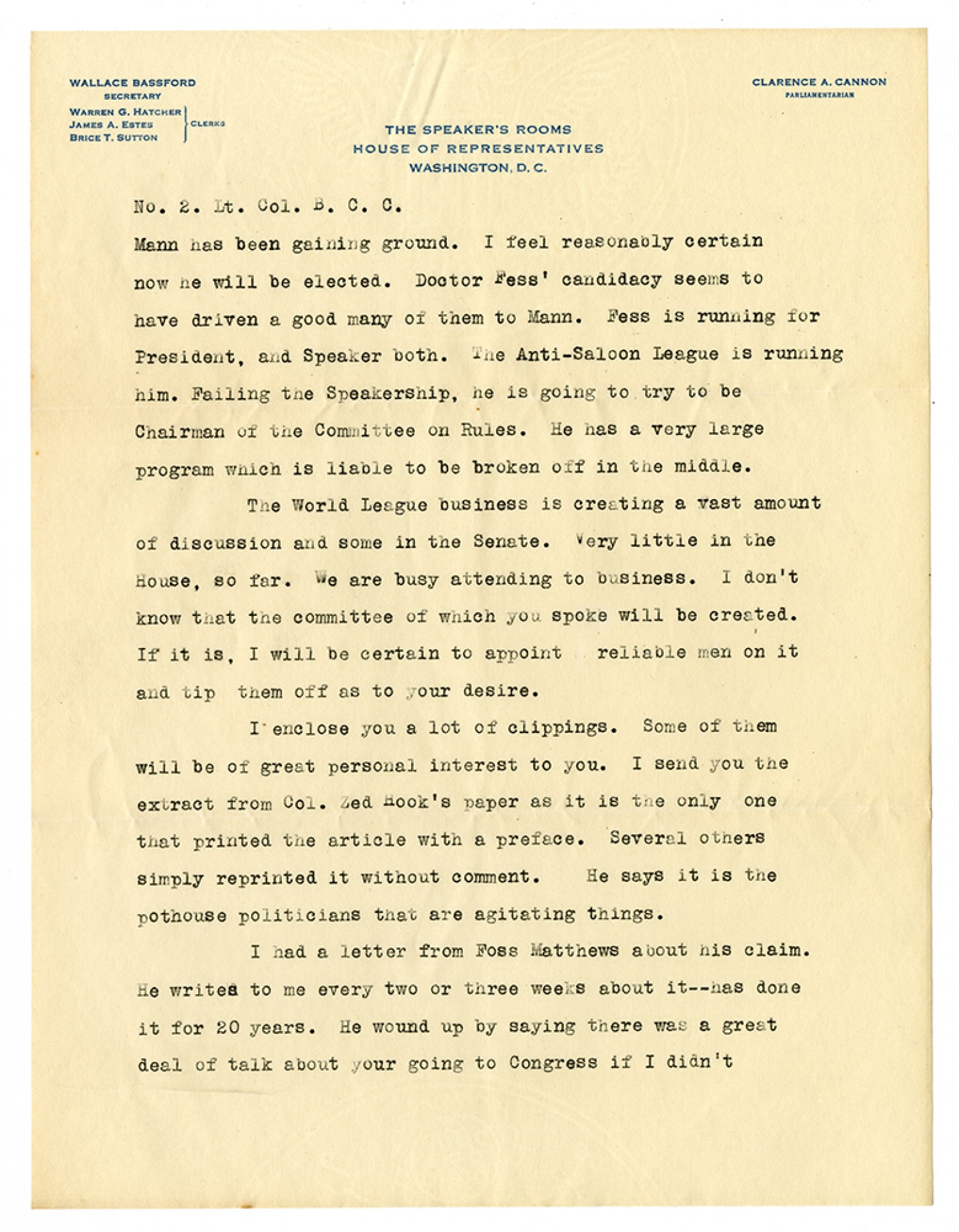 No. 2. Lt. Col. B.C.C. Mann has been gaining ground. I feel reasonably certain now he will be elected. Doctor Fess’ candidacy seems to have driven a good many of them to Mann. Fess is running for President, and Speaker both. The Anti-Saloon League is running him. Failing the Speakership, he is going to try to be Chairman of the Committee on Rules. He has a very large program which is liable to be broken off in the middle. The World League business is creating a vast amount of discussion and some in the Senate. Very little in the House, so far. We are busy attending to business. I don’t know that the committee of which you spoke will be created. If it is, I will be certain to appoint reliable men on it and tip them off as to your desire. I enclose you a lot of clippings. Some of them will be of great personal interest to you. I send you the extract from Col. Zed Hook’s paper as it is the only one that printed the article with a preface. Several others simply reprinted it without comment. He says it is the pothouse politicians that are agitating things. I had a letter from Foss Matthews about his claim. He writes to me every two or three weeks about it--has done it for 20 years. He wound up by saying there was a great deal of talk about your going to Congress if I didn’t
