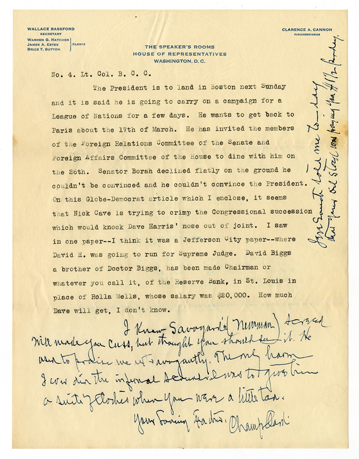 No. 4. Lt. Col. B.C.C. The President is to land in Boston next Sunday and it is said he is going to carry on a campaign for a League of Nations for a few days. He wants to get back to Paris about the 17th of March. He has invited the members of the Foreign Relations Committee of the Senate and Foreign Affairs Committee of the House to dine with him on the 26th. Senator Borah declined flatly on the ground he couldn’t be convinced and he couldn’t convince the President. On this Globe-Democrat article which I enclose, it seems that Nick Cave is trying to crimp the Congressional succession which would knock Dave Harris’ nose out of joint. I saw in one paper -- I think it was a Jefferson City paper -- where David H. was going to run for Supreme Judge. David Biggs a brother of Doctor Biggs, has been made Chairman or whatever you call it, of the Reserve Bank, in St. Louis in place of Rolla Wells, whose salary was $20,000. How much Dave will get, I don’t know. I know Savogard’s (Newman) [ms illegible: 1 wd] will make you cuss, but thought you should see it. He used to praise me extravagantly. The only harm I ever did the infernal scoundril was to give him a suit of clothes when you were a little tod. Your Loving Father, Champ Clark [written vertically in right margin] Jere South told me today that your oil stock was paying you A 1 ½ per day.
