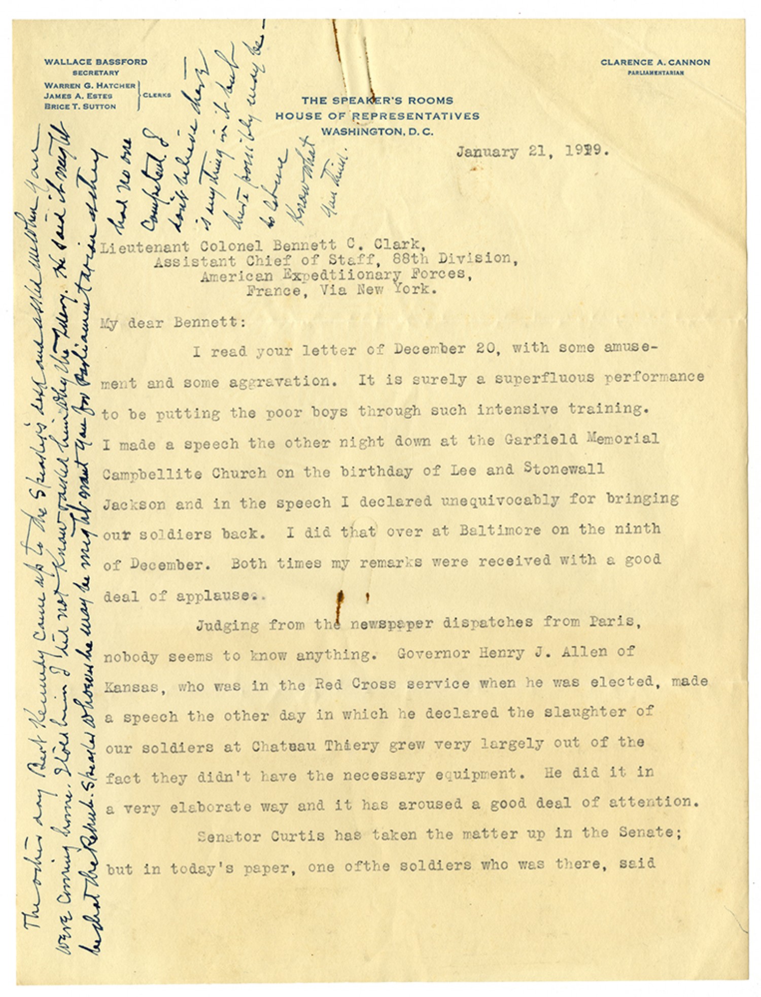 January 21, 1919. Lieutenant Colonel Bennett C. Clark, Asst. Chief of Staff 88th Division American Expeditionary Forces in France via New York: My Dear Bennett: I read your letter of December 20, with some amusement and some aggravation. It is surely superfluous performance to be putting the poor boys through such intensive training. I made a speech the other night down at the Garfield Memorial Campbellite Church on the birthday of Lee and Stonewall Jackson and in the speech I declared unequivocally for bringing our soldiers back. I did that over at Baltimore on the 9th of December. Both times my remarks were received with a good deal of applause. Judging the newspaper dispatched from Paris, nobody seems to know anything. Governor Henry J. Allen of Kansas, who was in the Red Cross service when he was elected, made a speech the other day in which he declared the slaughter of our soldiers at Chateau Thiery grew very largely out of the fact they didn’t have the necessary equipment. He did it in a very elaborate way and it has aroused a good deal of attention. Senator Curtis has taken the matter up in Senate; but in today’s paper ,one of the soldiers who was there, said [written in left margin] The other day Beof Kennedy came up to the Speaker’s desk and asked me when you were coming home. I told him I did not know and asked him why the query. He said it might be that the Repub. Speaker whoever he may be might want you for Parlimentarian as they had no one competent. I don’t believe there is anything in it but there possibly may be so let me know what you think.