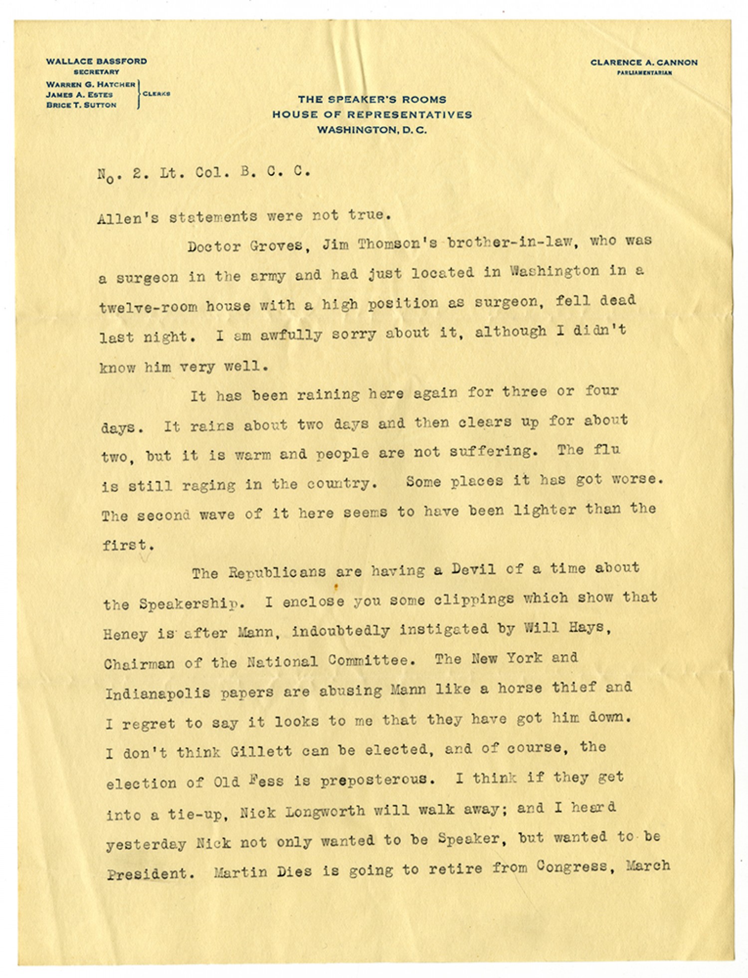 No. 2. Lt. Col. B. C. C. Allen’s statements were not true. Doctor Groves, Jim Thomson’s brother-in-law, who was a surgeon in the army and had just located in Washington in a twelve-room house with a high position as surgeon, fell dead last night. I am awfully sorry about it. Although I didn’t know him very well. It has been raining here again for three or four days. It rains two days and then clears up for about two, but it is warm and people are not suffering. The flu is still raging in the country. Some places it has got worse. The second wave of it here seems to have been lighter than the first. The Republicans are having a Devil of a time about the Speakership. I enclose you some clippings which show that Heney is after Mann, indoubtedly instigated by Will Hays, Chairman of the National Committee. The New York and Indianapolis [Indiana] papers are abusing Mann like a horse thief and I regret to say it looks to me that they have got him down. I didn’t think Gillett can be elected, and of course, the election of Old Fess is preposterous. I think if they get into a tie-up, Nick Longworth will walk away; and I heard yesterday Nick not only wanted to be Speaker, but wanted to be President. Martin Dies is going to retire from Congress, March