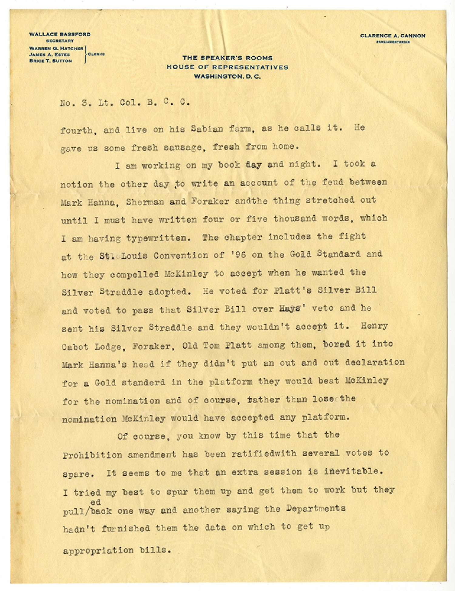 No. 3. Lt. Col. B. C. C. fourth, and live on his Sabian farm, as he calls it. He gave us some fresh sausage, fresh from home. I am working on my book day and night. I took a notion the other day to write an account of the feud between Mark Hanna, Sherman and Foraker and the thing stretched out until I must have written four or five thousand words, which I am having typewritten. The chapter includes the fight at the St. Louis [Missouri] Convention [1896] on the Gold Standard and how they compelled McKinley to accept when he wanted the Silver Straddle adopted. He voted for Platt’s Silver Bill and voted to pass that Silver Bill over Hays’ veto and he sent his Silver Straddle and then wouldn’t accept it. Henry Cabot Lodge, Foraker, Old Tom Platt among them, bored it into Mark Hanna’s head if they didn’t put an out and out declaration for a Gold standard in the platform they would beat McKinley for the nomination and of course, rather than lose the nomination McKinley would have accepted any platform. Of course, you know by this time that the Prohibition amendment has been ratified with several votes to spare. It seems to me that an extra session is inevitable. I tried my best to spur them up and get them to work but they pulled back one way and another saying the Departments hadn’t furnished them the data on which to get up appropriation bills.