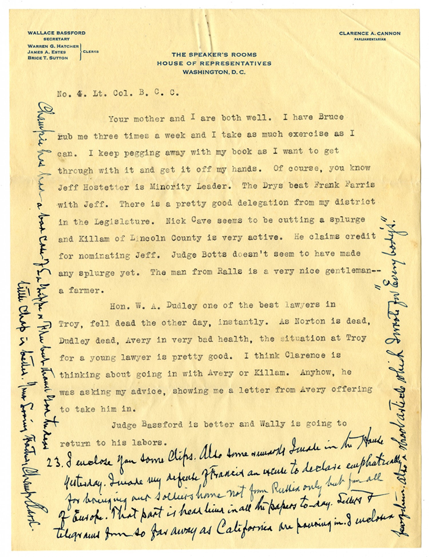 No. 4. Lt. Col. B. C. C. Your mother and I are both well. I have Bruce rub me three times a week and I take as much exercise as I can. I keep pegging away with my book as I want to get through with it and get it off my hands. Of course, you know Jeff Hostetter is Minority Leader. The Drys beat Frank Farris with Jeff. There is a pretty good delegation from my district in the legislature. Nick Cave seems to be cutting a splurge and Killam of Lincoln County is very active. He claims credit for nomination Jeff. Judge Botts doesn’t seem to have made any splurge yet. The man Ralls is a very nice gentleman--a farmer. Hon. W. A. Dudly one of the best lawyers in Troy, fell dead the other day, instantly. As Norton is dead, Dudley dead, Avery in very bad health, the situation at Troy for a young lawyer is pretty good. I think Clarence is thinking about going in with Avery or Killam. Anyhow, he was asking my advice, showing me a letter from Avery offering to take him in. Judge Bassford is better and Wally is going to return to his labors. 23. I enclose you some clips. Also some remarks I made in the House yesterday. I made my defense of Francis an excuse to declare emphatically for bringing our soldiers home not from Russia only but from all of Europe. That part is headlined in all the papers to-day. Letter and telegrams from so far away as California are pouring in. I enclosed [written in right margin] few of them about article which I wrote for “Everybody’s” [written in left margin] Champie has had a bad case of the Grippe or flu but thank God the dear little chap is better. Your Loving Father, Champ Clark