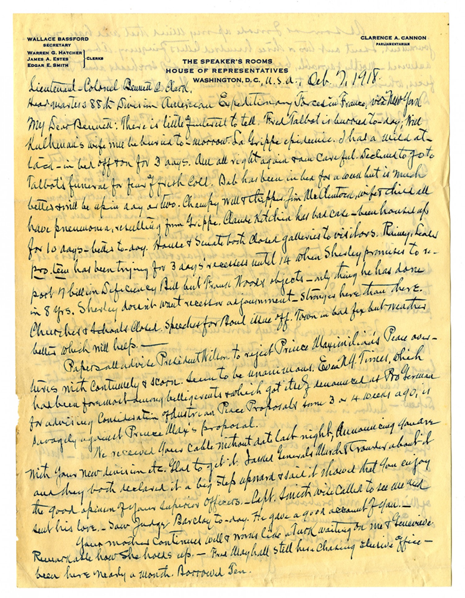 U.S.A., [October 7, 1918]. Lieutenant-Colonel Bennett C. Clark, Headquarters 88th Division American Expeditionary Forces in France, Via New York My Dear Bennett: There is little of interest to tell. Fred Talbot is burried to-day: Will Kulman’s wife will be burried to-morrow. La Grippe epidemic. I had a wild attack-in bed off & on for 3 days. Am all right again & am careful. Declined to go to Talbot’s funeral for fear of fresh cold. Dab has been in bed for a week but is much better & will be up in a day or two. Champy well & chipper Jim McClintock, wife & child all have pneumonia, & chulling from Grippe. Claude Kitchen has bad case – been housed up for 10 days – better to-day. House & Senate both closed galleries to visitors. Rainy, Leader pro.tem has been trying for 3 days recessess until 14 when Sherley promises to report 7 bill on Deficiency Bill but Frank Noods objects – only thing he has done in 8 yrs. Sherley doesn’t want recess or adjournment – stronger here than there. Churches & schools closed. Speeches Bond issue off. Town in bad fix but weather better which will help.—Papers all advise President [Woodrow] Wilson to reject Prince Maximilians Peace overtures with contumely & scorn. Seem to be unanimous. Even [New York Times], which has been foremost among belligerents & which got itself denounced at Pro German for advising Consideration of Austrian Peace Proposals some 3 or 4 weeks ago, is savagely against Prince Max’s proposal. We received your cable without date last night, Announcing you are with your new division etc. Glad to get it. Talked Generals March & Crowder about it & they both declared it a big step upward & said it showed that you enjoy the good opinion of your superior officers. – Capt. Smith wife called to see me & sent his love. - Saw Judge Barclay to-day. He gave a good account of You. - Your mother continues well & works like a Turk waiting on me & Genevieve. Remarkable how she holds up. - Fred Mayhall still here & chasing elusive office – been here nearly a month. Borrowed Ten.