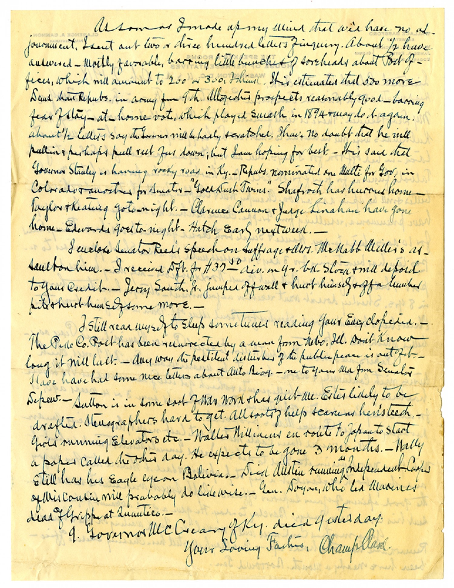 As soon as I made up my mind that we’d have no adjournment. I sent out two or three hundred letters of inquiry. About ½ have answered – Mostly favorable, barring little bunches of soreheaded about Post offices, which will amount to 200 or 300, I think. It is estimated that 500 more Dems than Repubs. in army from 9th. Altogether prospects reasonably good – barring fear of stay-at-home vote, which played swath in 1894 & may do it again. about ½ letters say the Governor will be badly scratched. I have No doubt that he will pull in & perhaps pull rest of us down; but I am hoping for best. - This said that Governor Stanley is having rocky road in [Kentucky]. - Repubs. nominated one Multi for Gov. in Colorado & another for Senator - “Gold Duck Twins.” Shafroth has hurried home – Taylor & Keating got to-night. - Clarence Cannon & Judge Linahan have gone home – Edwards goes to-night – Hatch Early next week. - I enclose Senator Reed’s speech on Suffrage & Mrs, McNabb Miller’s assault on him. - I received Dft. for H 37.50 in yr. bk. Stock & will deposit to your credit. - Jerry South. Jr. jumped off wall & hurt himself & off a lumber pile & hurt himself some more. - I still read myself to sleep sometimes reading your Encyclopedia. - The Pike Co. Port has been resurrected by a man from Nebo, [Illinois]. Don’t Know long it will last. - Anyway the president disturbes of the public peace is out of it. - Have have had some nice letters about Auto Biog. - one to your Ma from Senator Depew. - Sutton is in some sort of War Work & has left me. Estes likely to be drafted. Stenographers hard to get. All sorts of help & care at hen’s teeth. - Girl’s running Elevators etc. - Walter Williams en route to Japan to start a paper called the other day. He expects to be gone 3 months. - Wally still has his Eagle eye on Balivia. - Dick Austen running as Independent Cooper of Wisconsin will probably do like wise. - Gen. Dayon, who led Marines dead of Grippe at Quentico. - 9. Governor McCreary of [Kentucky] died yesterday. Your Loving Father, Champ Clark.