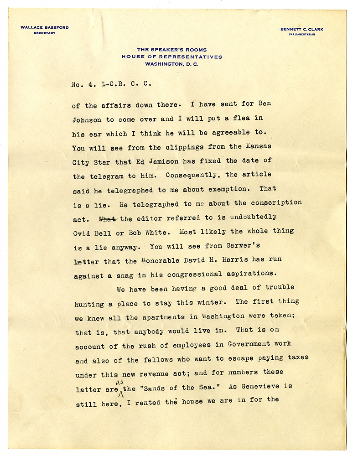 No. 4. L-C. B. C. C. of the affairs down there. I have sent for Ben Johnson to come over and I will put a flea in his ear which I think he will be agreeable to. You will see from the clippings from the Kansas City Star that Ed Jamison has fixed the date of the telegram to him. Consequently, the article said he telegraphed to me about exemption. That is a lie. He telegraphed to me about the conscription act. the editor referred to is undoubtedly Ovid Bell or Bob White. Most likely the whole thing is a lie anyway. You will see from Garver’s letter that the Honorable David H. Harris has run against a snag in his congressional aspirations. We have been having a good deal of trouble hunting a place to stay this winter. The first thing we knew all the apartments in Washington were taken; that is, that anybody would live in. That is on account of the rush of employees in Government work and also of the fellows who want to escape paying taxes under this new revenue act; and for numbers these latter are as the “Sands of the Sea.” As Genevieve is still here, I rented the house we are in for the