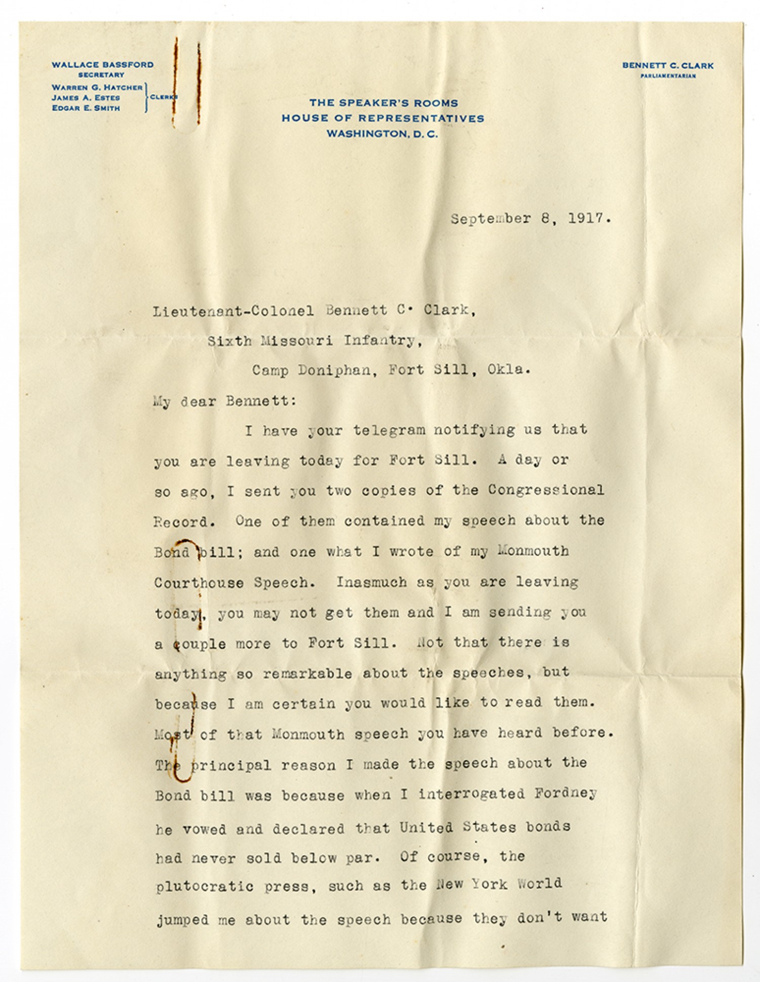September 8, 1917. Lieutenant-Colonel Bennett C. Clark, Sixth Missouri Infantry, Camp Doniphan, Fort Sill, [Oklahoma] My dear Bennett: I have your telegram notifying us that you are leaving today for Fort Sill. A day or so ago, I sent you two copied of the Congressional Record. One of them contained my speech about the Bond bill; and one what I wrote of my Monmouth Courthouse Speech. Inasmuch as you are leaving today, you may not get them and I am sending you a couple more to Fort Sill. Not that there is anything so remarkable about the speeches, but because I am certain you would like to read them. Most of that Monmouth speech you have heard before. The principal reason I made the speech about the Bond bill was because when I interrogated Fordney he vowed and declared that United States bonds had never sold below par. Of course, the plutocratic press, such as the New York World jumped me about the speech because they don’t want