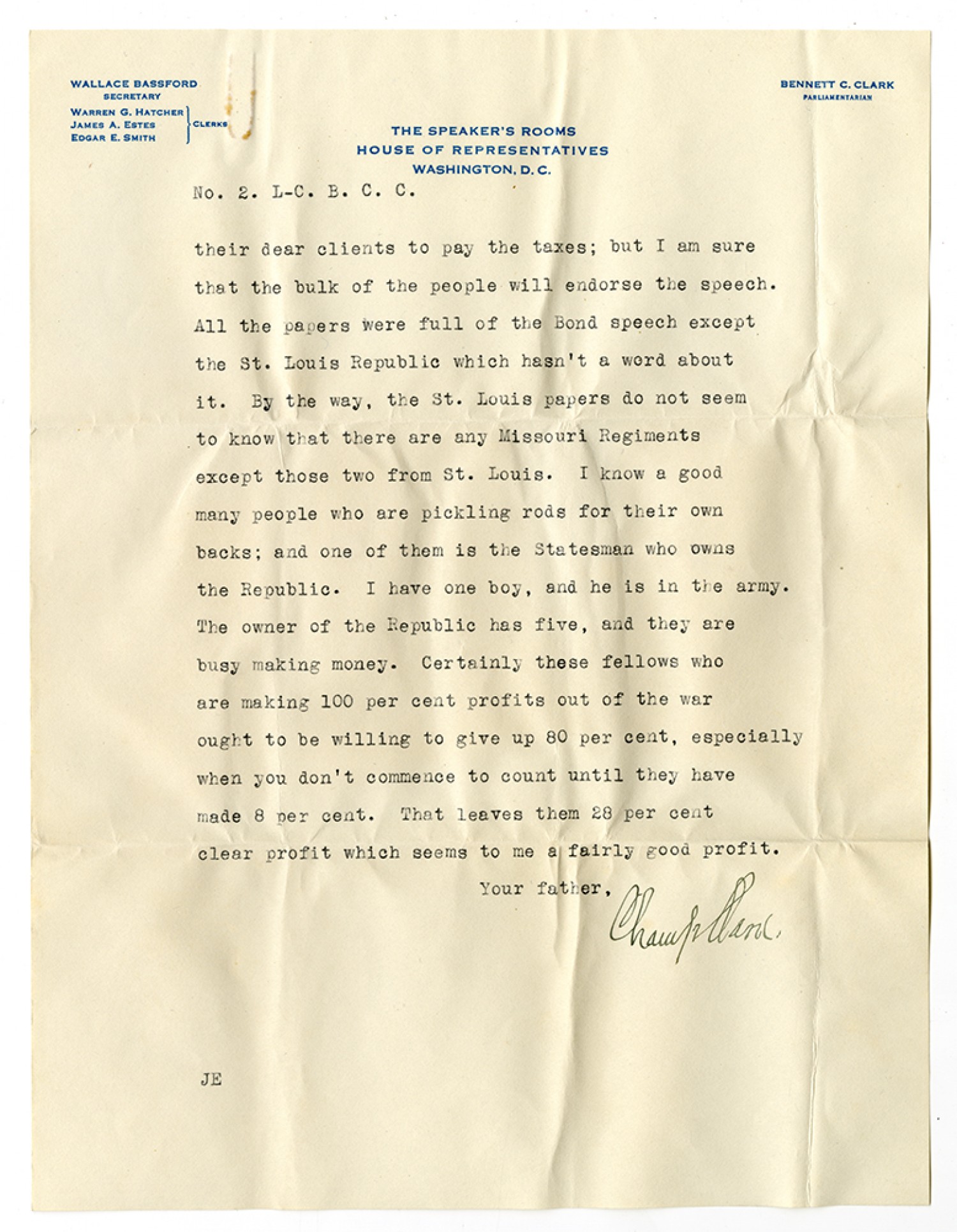 No. 2. L-C. B. C. C. their dear clients to pay the taxes; but I am sure that the bulk of the people will endorse the speech. All the papers were full of the Bond speech except the St. Louis Republic which hasn’t a word about it. By the way, the St. Louis papers do not seem to know that there are any Missouri Regiments except those two from St. Louis. I know a good many people who are pickling rods for their own backs; and one of them is the Statesman who owns the Republic. I have one boy, and he is in the army. The owner of the Republic has five, and they are busy making money. Certainly these fellows who are making 100 per cent profits out of the war ought to be willing to give up 80 per cent, especially when you don’t commence to count until they have made 8 per cent. That leaves them 28 per cent clear profit which seems to me a fairly good profit. Your father, Champ Clark.