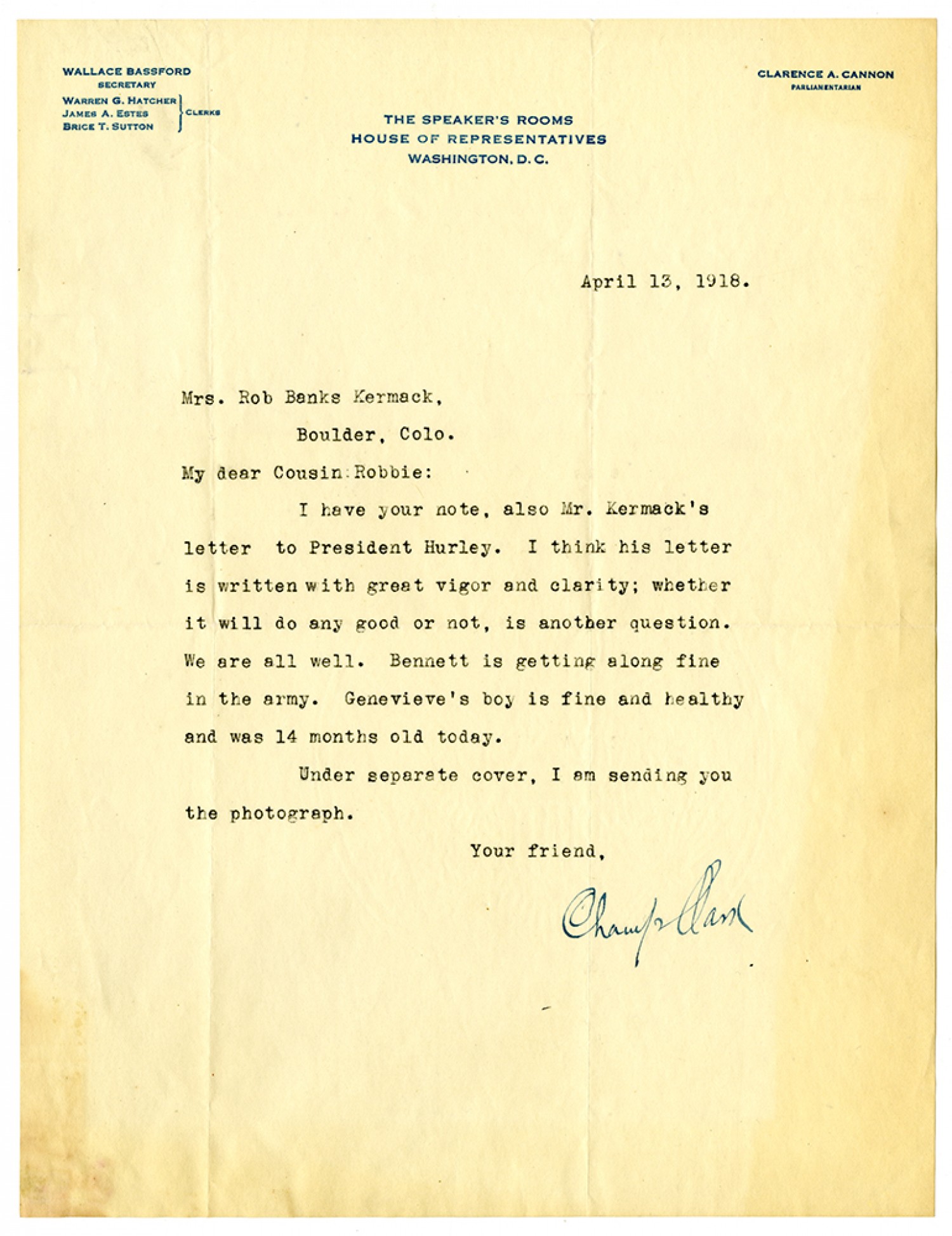 April 13, 1918. Mrs. Rob Banks Kermack, Boulder [Colorado] My dear Cousin Robbie: I have your note, also Mr. Kermack’s letter to President Hurley. I think his letter is written with great vigor and clarity; whether it will do any good or not, is another question. We are still all well. Bennett is getting along fine in the army. Genevieve’s boy is fine and healthy and was 14 months old today. Under separate cover, I am sending you the photograph. Your friend, Champ Clark