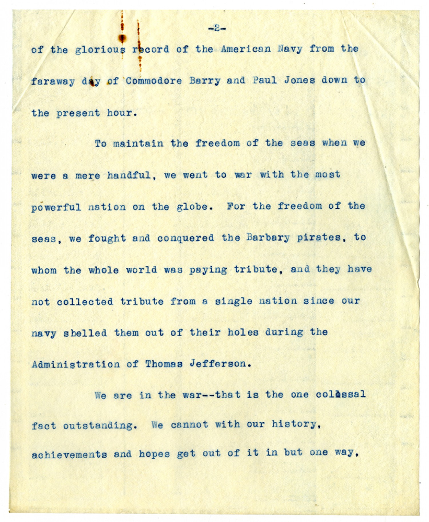 [page 2] of the glorious record of the American Navy from the faraway day of Commodore Berry and Paul Jones down to the present hour. To maintain the freedom of the seas when we were a mere handful, we went to war with the most powerful nation on the globe. For the freedom of the seas, we fought and conquered the Barbary pirates, to whom the whole world was paying tribute, and they have not collected tribute from a single nation since our navy abelled them out of their holes during the Administration of Thomas Jefferson. We are in the war—that is the one colossal fact outstanding. We cannot with our history, achievements and hopes get out of it in but one way,