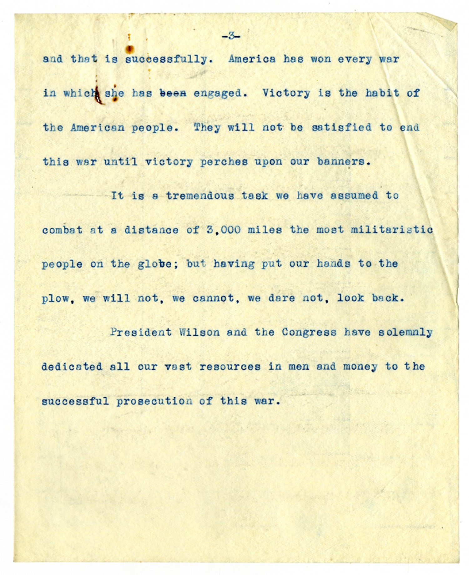 [page 3] and that is successfully. America has won every war in which she has been engaged. Victory is the habit of the American people. They will not be satisfied to end this war until victory perches upon our banners. It is a tremendous task we have assumed to combat at a distance of 3,000 miles the most militaristic people on the globe; but having put our hands to the plow, we will not, we cannot, we dare not, look back. President Wilson and the Congress have solemnly dedicated all our vast resources in men and money to the successful prosecution of this war.