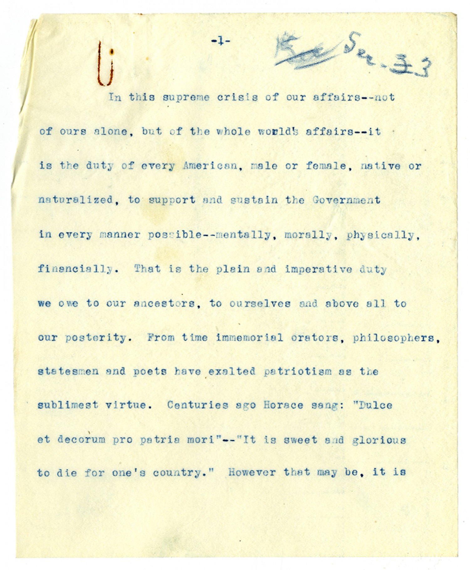 [page 1] In this supreme crisis of our affairs--not of ours alone, but of the whole world’s affairs—it is the duty of every American, male or female, native or naturalized, to support and sustain the Government in every manner possible--mentally, morally, physically, financially. That is the plain and imperative duty we owe to our ancestors, to ourselves and above all to our posterity. From time immemorial orators, philosophers, statesmen and poets have exalted patriotism as the sublimest virtue. Centuries ago Horace sang: “Dulce et decorum pro patris mori”--“It is sweet and glorious to die for one’s country.” However that may be, it is