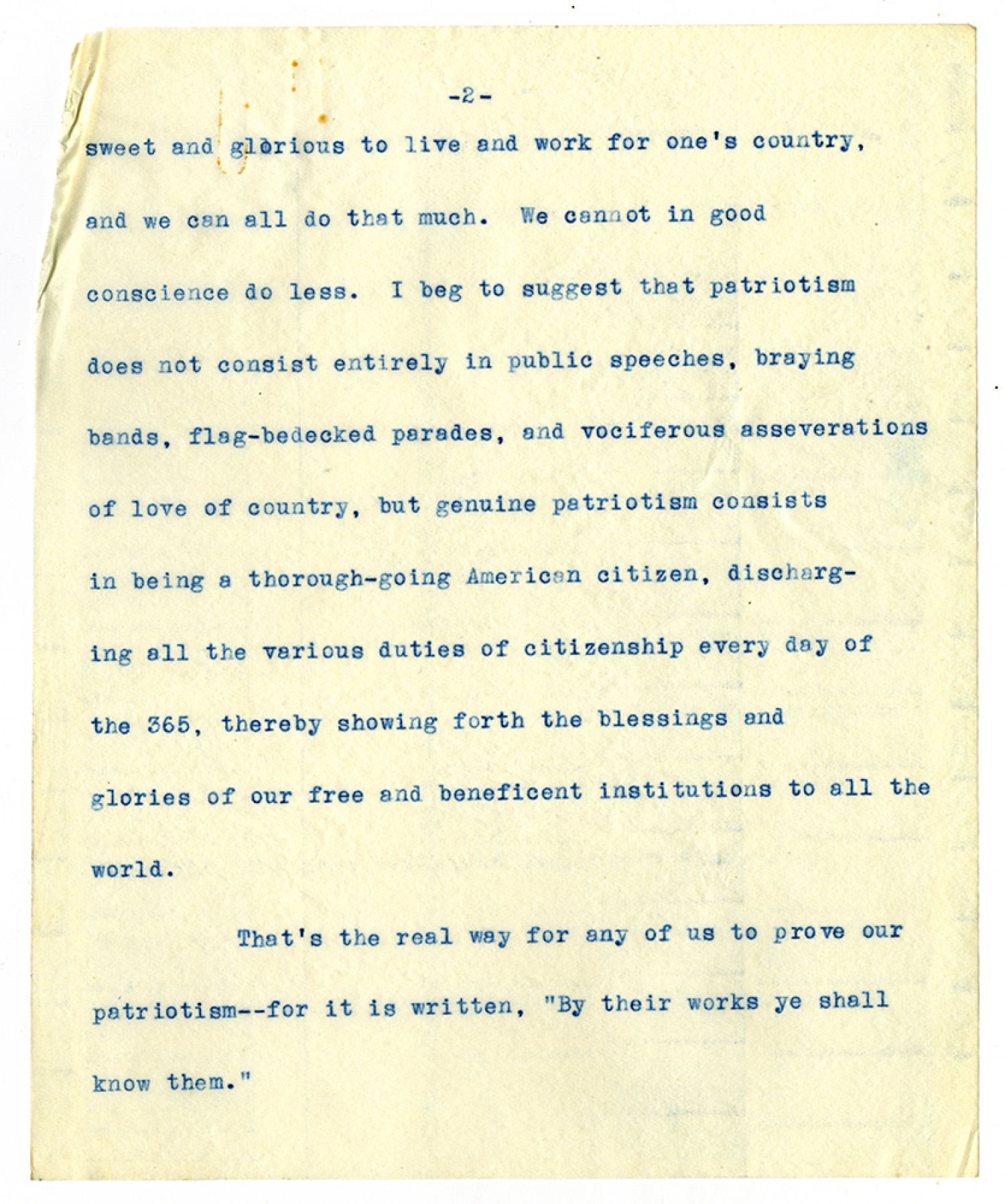 [page 2] sweet and glorious to live and work for one’s country, and we can all do that much. We cannot in good conscience do less. I beg to suggest that patriotism does not consist entirely in public speeches, braying bands, flag-bedecked parades, and vociferous asseverations of love of country, but genuine patriotism consists in being a thorough-going American citizen, discharging all the various duties of citizenship every day of the 365, thereby showing forth the blessings and glories of our free and beneficent institutions to all the world. That’s the real way for any of us to prove our patriotism--for it is written, “By their works ye shall know them.”