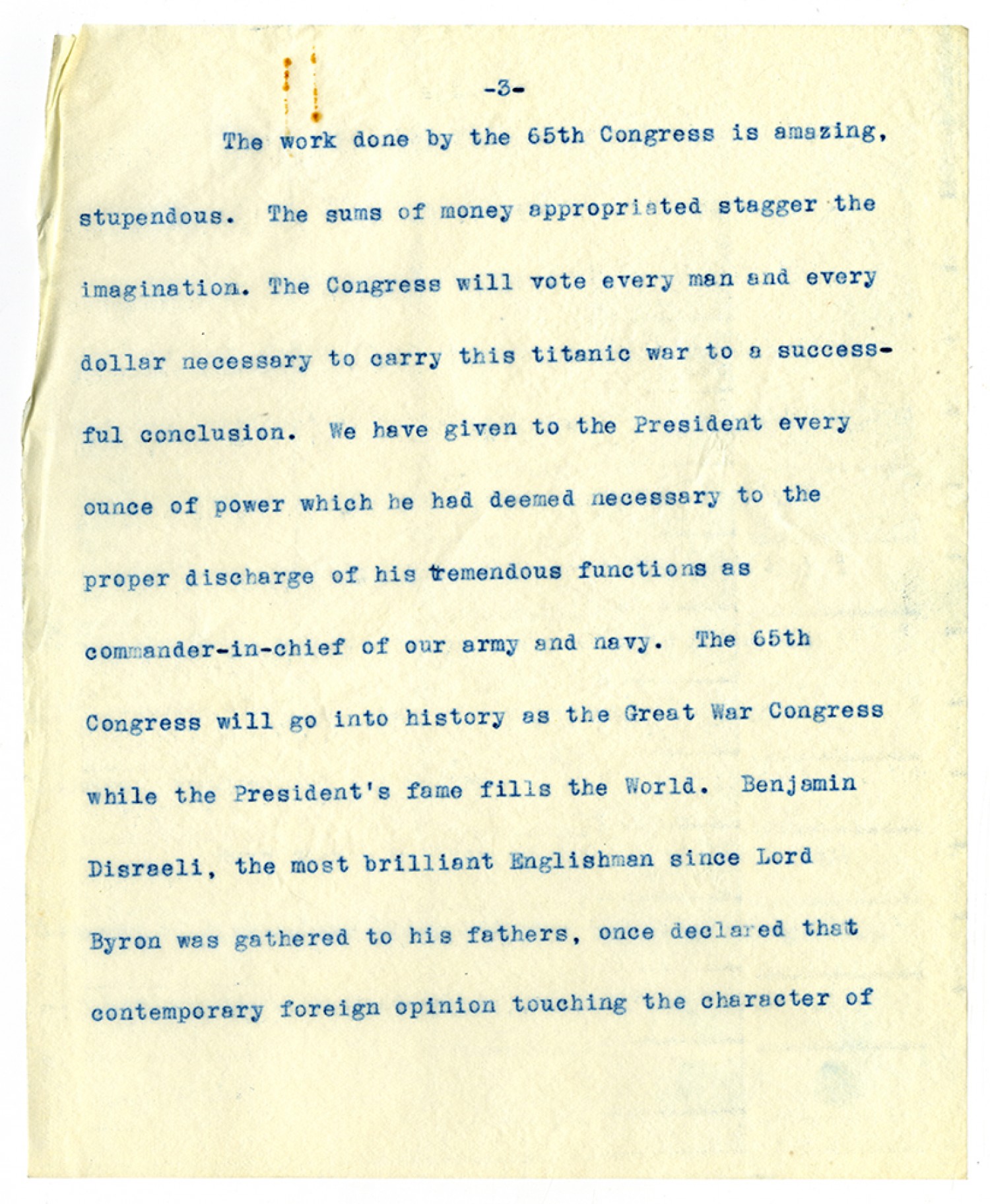 [page 3] The work done by the 65th Congress is amazing, stupendous. The sums of money appropriated stagger the imagination. The Congress will vote every man and every dollar necessary to carry this titanic war to a successful conclusion. We have given to the President every ounce of power which he had deemed necessary to the proper discharge of his tremendous functions as commander-in-chief of our army and navy. The 65th Congress will go into history as the Great War Congress while the President’s fame fills the World. Benjamin Disraeli, the most brilliant Englishman since Lord Byron was gathered to his fathers, once declared that contemporary foreign opinion touching the character of