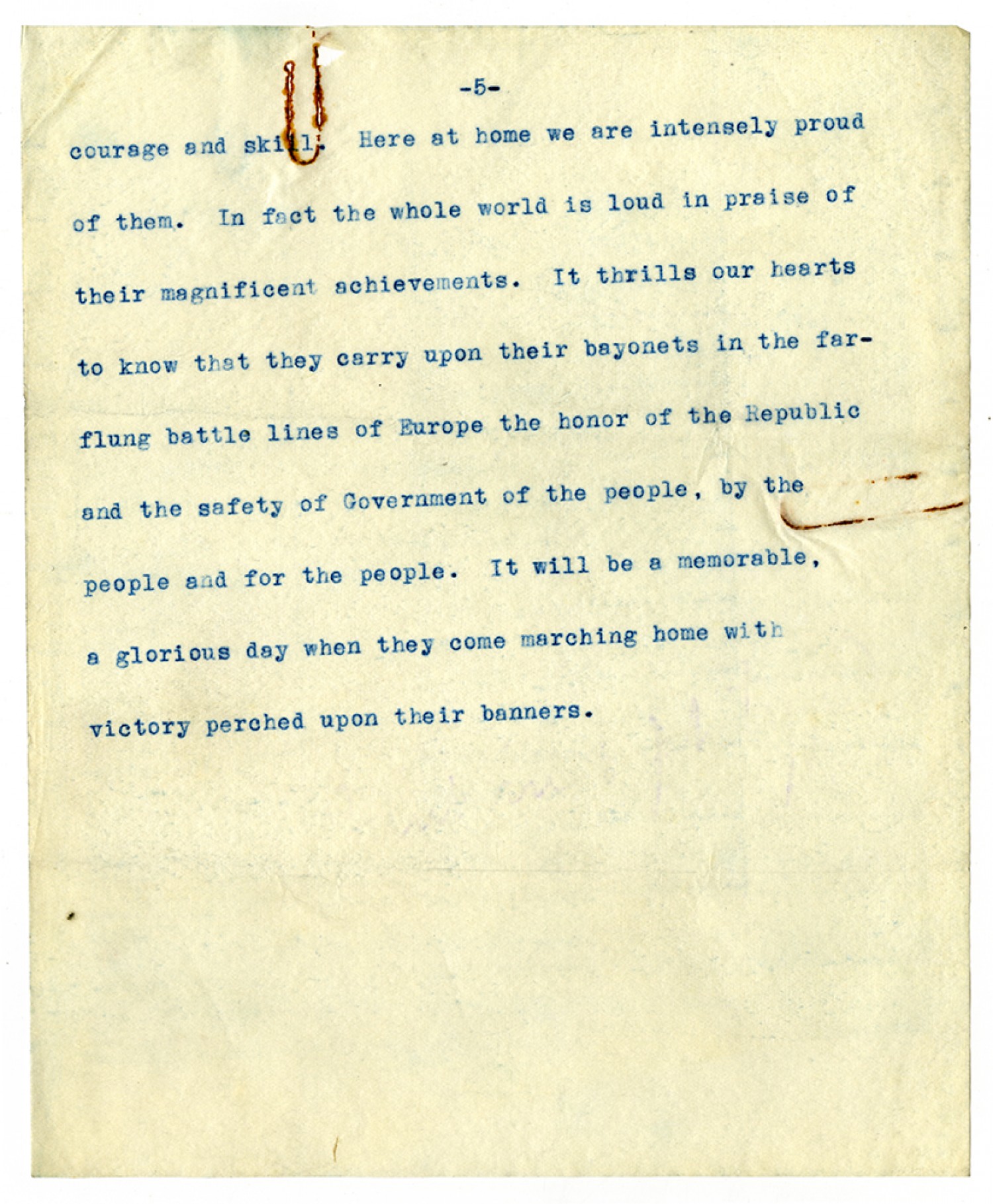[page 5] courage and skill. Here at home we are intensely proud of them. In fact the whole world is loud in praise of their magnificent achievements. It thrills our hearts to know that they carry upon their bayonets in the far flung battle lines of Europe the honor of the Republic and the safety of Government of the people, by the people and for the people. It will be a memorable, a glorious day when they come marching home with victory perched upon their banners.