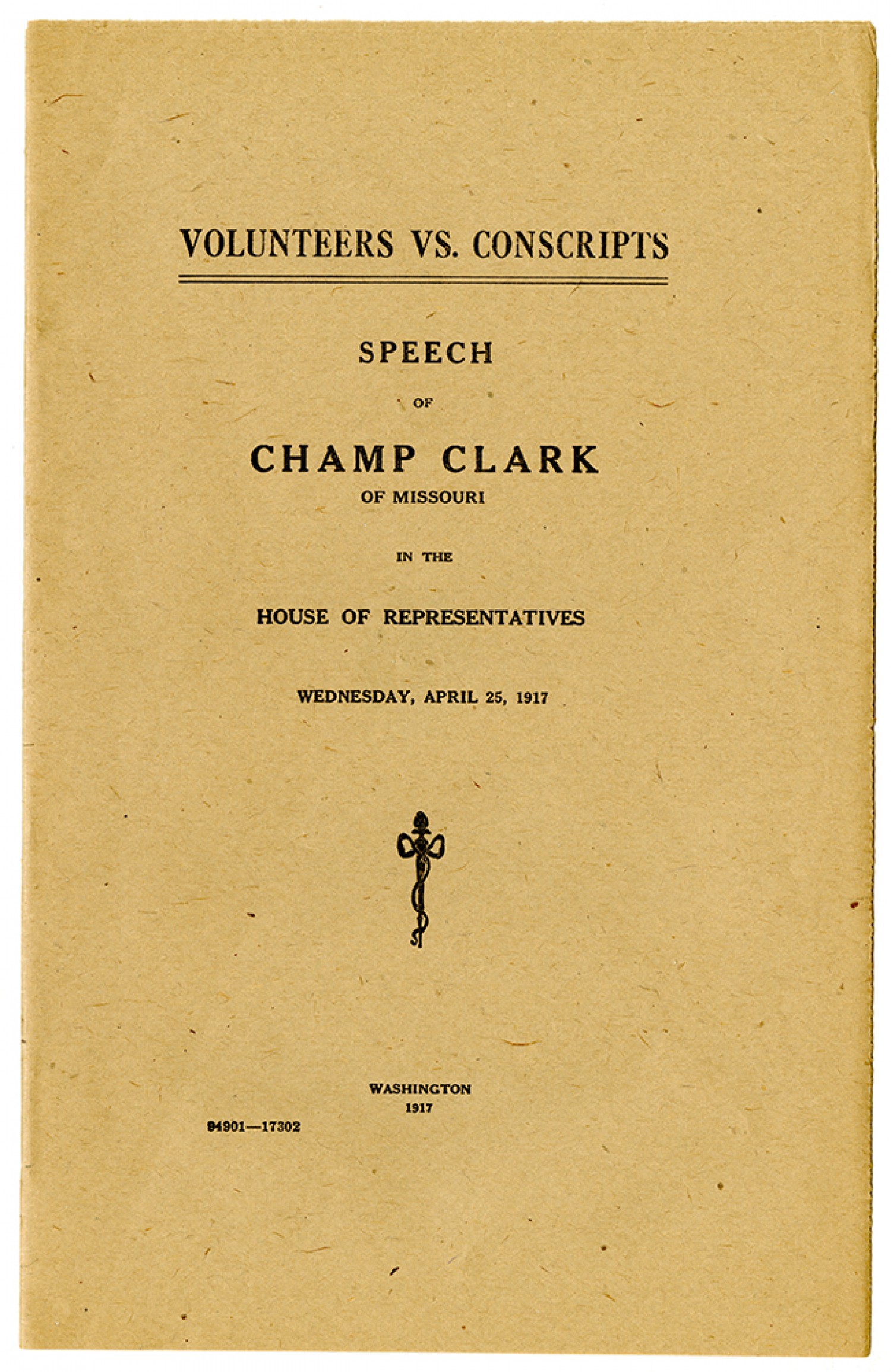 | Source | Clark, Champ. Champ Clark's speech, "Volunteers vs. Conscripts" given before the House of Representatives. 25 April 1917. Clark, Champ (1850-1921) and Bennett Champ (1890-1954), Papers, 1853-1973. C0666. The State Historical Society of Missouri, Columbia, |