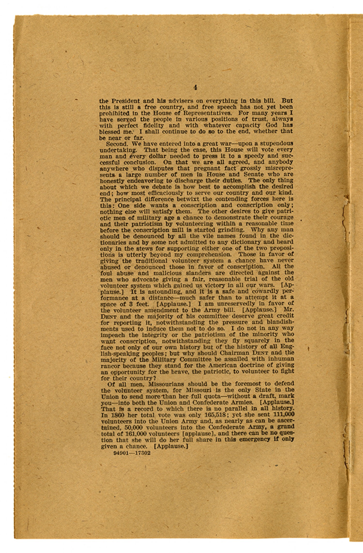[page 4] the President and his advisers on everything in this bill. But this is still a free country, and free speech has not yet been prohibited in the House of Representatives. For many years I have served the people in various positions of trust, always with perfect fidelity and with whatever capacity God has blessed me. I shall continue to do so to the end, whether that be near or far. Second. We have entered into a great war - upon a stupendous undertaking. That being the case, this House will vote every man and every dollar needed to press it to a speedy and successful conclusion. On that we are all agreed, and anybody anywhere who disputes that pregnant fact grossly misrepresents a large number of men in House and Senate who are honestly endeavoring to discharge their duties. The only thin about which we debate is how best to accomplish the desired end; how most efficaciously to serve our country and our kind. The principal difference betwixt the contending forces here is this : One side wants a conscription and conscription only; nothing else will satisfy them. The other desire to give patriotic men of military age a chance to demonstrate their courage and their patriotism by volunteering within a reasonable time before the conscription mill is started grinding. Why any man should be denounced by all the vile names found in the dictionaries is utterly beyond my comprehension. Those in favor of giving the traditional volunteer system a chance have never abused or denounced those in favor of conscription. All the foul abuse and malicious slanders are directed against the men who advocate giving a fair, reasonable trial of the old volunteer system which gained us victory in all our wars. (Applause.) It is astounding, and it is a safe and cowardly performance at a distance - much safer than to attempt it at a space of 3 feet. (Applause.) I am unreservedly in favor of the volunteer amendment to the Army bill. (Applause.) Mr. DENT and the majority of his committee deserve great credit for reporting it, notwithstanding the pressure and blandishments used to induce them not to do so. I do not in any way impeach the integrity or the patriotism of the minority who want conscription, notwithstanding they fly squarely in the face not only of our own history but of the history of all English-speaking peoples; but why should Chairman Dent and the majority of the Military Committee be assailed with inhuman rancor because they stand for the American doctrine of giving an opportunity for the brave, the patriotic, to volunteer to fight for their country? Of all men, Missourians should be the foremost to defend the volunteer system, for Missouri is the only State in the Union to send more than her full quota - without a draft, mark you - into both the Union and Confederate Armies. (Applause.) That is a record to which there is no parallel in all history. In 1860 her total vote was only 165,518; yet she sent 111,000 volunteers into the Union Army and, as nearly as can be ascertained, 50,000 volunteers into the Confederate Army, a grand total of 161,000 volunteers (applause), and there can be no question that she will do her full share in this emergency if only given a chance. (Applause.)