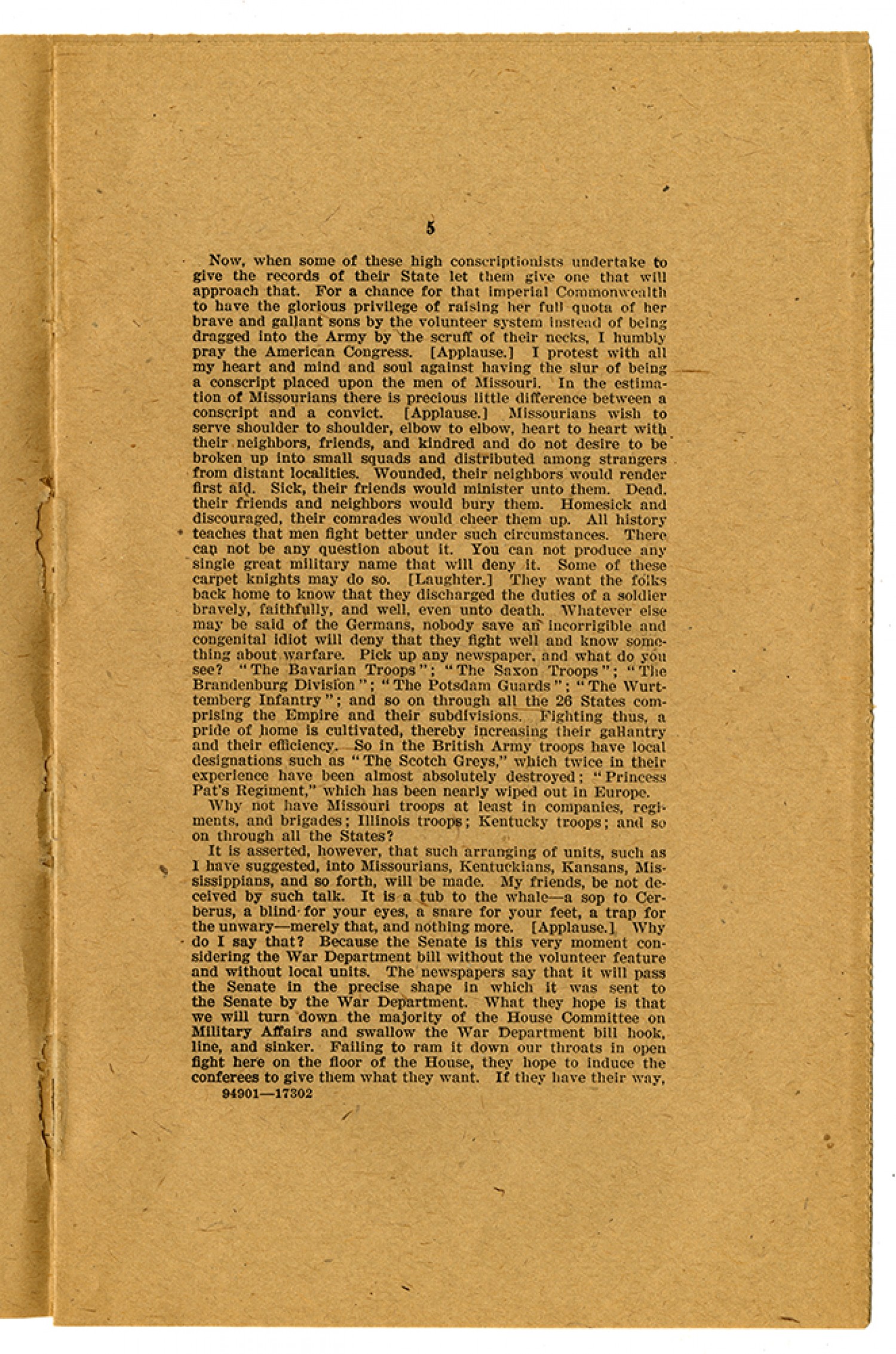 [page 5] Now, when some of these high conscriptionists undertake to give the records of their State let them give one that will approach that. For a chance for that imperial Commonwealth to have the glorious privilege of raising her full quota of her brave and gallant sons by the volunteer system instead of being dragged into the Army by the scruff of their necks, I humbly pray the American Congress. (Applause.) I protest with all my heart and mind and soul against having the slur of being a conscript placed upon the men of Missouri. In the estimation of Missourians there is precious little difference between a conscript and a convict. (Applause.) Missourians wish to serve shoulder to shoulder, elbow to elbow, heart to heart with their neighbors, friends, and kindred and do not desire to be broken up into small squads and distributed among strangers from distant localities. Wounded, their neighbors would render first aid. Sick, their friends would minister unto them. Dead. their friends and neighbors would bury them. Homesick and discouraged, their comrades would cheer them up. All history teaches that men fight better under such circumstances. There can not be any question about it. You can not produce any single great military name that will deny it. Some of these carpet knights may do so. (Laughter.) They want the folks back home to know that they discharged the duties of a soldier bravely, faithfully, and well, even unto death. Whatever else may be said of the Germans, nobody save an incorrigible and congenital idiot will deny that they fight well and know something about warfare. Pick up any newspaper, and what do you see? “The Bavarian Troops”; “The Saxon Troops”; “The Brandenburg Division”; “The Potsdam Guards” ; “The Wurttemberg Infantry”; and so on through all the 26 States comprising the Empire and their subdivisions. Fighting thus, a pride of home is cultivated, thereby increasing their gallantry and their efficiency. So in the British Army troops have local designations such as “The Scotch Greys,” which twice in their experience have been almost absolutely destroyed; “Princess Pat’s Regiment,” which has been nearly wiped out in Europe. Why not have Missouri troops at least in companies, regiments, and brigades; Illinois troops; Kentucky troops; and so on through all the States? I is asserted, however, that such arranging of units, such as I have suggested, into Missourians, Kentuckians, Kansans, Mississippians, and so forth, will be made. My friends, be not deceived by such talk. It is a tub to the whale - a sop to Cerberus, a blind for your eyes, a snare for your feet, a trap for the unwary - merely that, and nothing more. (Applause.) Why do I say that? Because the Senate is this very moment considering War Department bill without the volunteer feature and without local units. The newspapers say that it will pass the Senate in the precise shape in which it was sent to the Senate by the War Department. What they hope is that we will turn down the majority of the House Committee on Military Affairs and swallow the War Department bill hook, line, and sinker. Failing to ram it down our throats in open fight here on the floor of the House, they hope to induce the conferees to give them what they want. If they have their way,