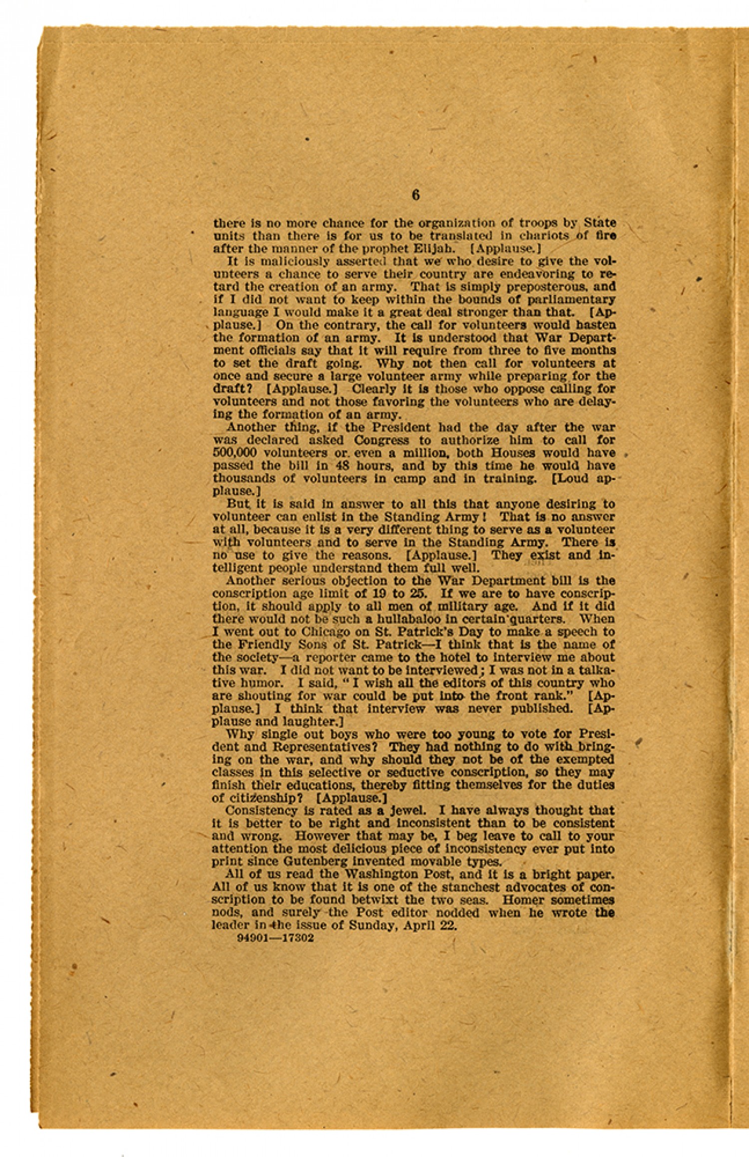[page 6] there is no more chance for the organization of troops by State units than there is for us to be translated in chariots of fire after the manner of the prophet Elijah. (Applause.) It is maliciously asserted that we who desire to give the volunteers a chance to serve their country are endeavoring to retard the creation of an army. That is simply preposterous, and if I did not want to keep within the bounds of parliamentary language I would make it a great deal stronger than that. (Applause.) On the contrary, the call for volunteers would hasten the formation of an army. It is understood that War Department officials say that it will require from three to five months to set the draft going. Why not then call for volunteers at once and secure a large volunteer army while preparing for the draft? (Applause.) Clearly it is those who oppose calling for volunteers and not those favoring the volunteers who are delaying the formation of an army. Another thing, if the President had the day after the war was declared asked Congress to authorize him to call for 500,000 volunteers or even a million, both Houses would have passed the bill in 48 hours, and by this time he would have thousands of volunteers in camp and in training. (Loud applause.) But it is said in answer to all this that anyone desiring to volunteer can enlist in the Standing Army! That is no answer at all, because it is a very different thing to serve as a volunteer with volunteers and to serve in the Standing Army. There is no use to give the reasons. (Applause.) They exist and intelligent people understand them full well. Another serious objection to the War Department bill is the conscription age limit of 19 to 25. If we are to have conscription, it should apply to all men of military age. And if it did there would not be such a hullabaloo in certain quarters. When I went out to Chicago on St. Patrick - I think that is the name of the society - a reporter came to the hotel to interview me about this war. I did not want to be interviewed; I was not in a talkative humor. I said, “I wish all the editors of this country who are shouting for war could be put into the front rank.” (Applause.) I think that interview was never published. (Applause and laughter.) Why single out boys who were too young to vote for President and Representatives? They had nothing to do with bringing on the war, and why should they not be of the exempted classes in this selective or seductive conscription, so they may finish their educations, thereby fitting themselves for the duties of citizenship? (Applause.) Consistency is rated as a jewel. I have always thought that it is better to be right and inconsistent than to be consistent and wrong. However that may be, I beg to leave to call to your attention the most delicious piece of inconsistency ever put into print since Gutenberg invented movable types. All of us read the Washington Post, and it is a bright paper. All of us know that it is one of the stanchest advocates of conscription to be found betwixt the two seas. Homer sometimes nods, and surely the Post editor nodded when he wrote the leader in the issue of Sunday, April 22.