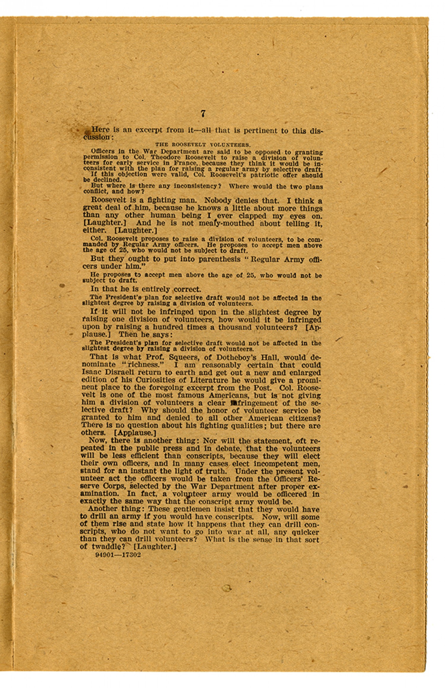 [page 7] Here is an excerpt from it - all that is pertinent to this discussion: THE ROOSEVELT VOLUNTEERS. Officers in the War Department are said to be opposed to granting permission to Col. Thoedore Roosevelt to raise a division of volunteers for early service in France, because they think it would be inconsistent with the plan for raising a regular army by selective draft. If this objection were valid, Col. Roosevelt’s patriotic offer should be declined. But where is there any inconsistency? Where would the two plans conflict, and how? Roosevelt is a fighting man. Nobody denies that. I think a great deal of him, because he knows a little about more things than any other human being I ever clapped my eyes on. (Laughter.) And he is not mealy-mouthed about telling it, either. (Laughter.) Col. Roosevelt proposes to raise a division of volunteers, to be commanded by Regular Army officers. He proposes to accept men above the age of 25, who would not be subject to draft. But they ought to put into parenthesis “Regular Army officers under him.” He proposes to accept men above the age of 25, who would not be subject to draft. In that he is entirely correct. The President’s plan for selective draft would not be affected in the slightest degree by raising a division of volunteers. If it will not be infringed upon in the slightest degree by raising one division of volunteers, how would it be infringed upon by raising a hundred times a thousands volunteers? (Applause.) Then he says: The President’s plan for selective draft would not be affected in the slightest degree by raising a division of volunteers. That is what Prof. Squeers, of Dotheboy’s Hall, would denominate “richness.” I am reasonably certain that could Isaac Disraeli return to earth and get out a new and enlarged edition of his Curiosities of Literature he would give a prominent place to the foregoing excerpt from the Post. Col. Roosevelt is one of the most famous Americans, but is not giving him a division of volunteers a clear infringement of the selective draft? Why should the honor of volunteer service be granted to him and denied to all other American citizens? There is no question about his fighting qualities; but there are others. (Applause.) Now, there is another thing: Nor will the statement, oft repeated in the public press and in debate, that the volunteers will be less efficient than conscripts, because they will elect their own officers, and in many cases elect incompetent men, stand for an instant the light of truth. Under the present volunteer act the officers would be taken from the Officers’ Reserve Corps, selected by the War Department after proper examination. In fact, a volunteer army would be officered in exactly the same way that the conscript army would be. Another thing: These gentlemen insist that they would have to drill an army if you would have conscripts. Now, will some of them rise and state how it happens that they can drill conscripts, who do not want to go into war at all, any quicker than they can drill volunteers? WHat is the sense in that sort of twaddle? (Laughter.)