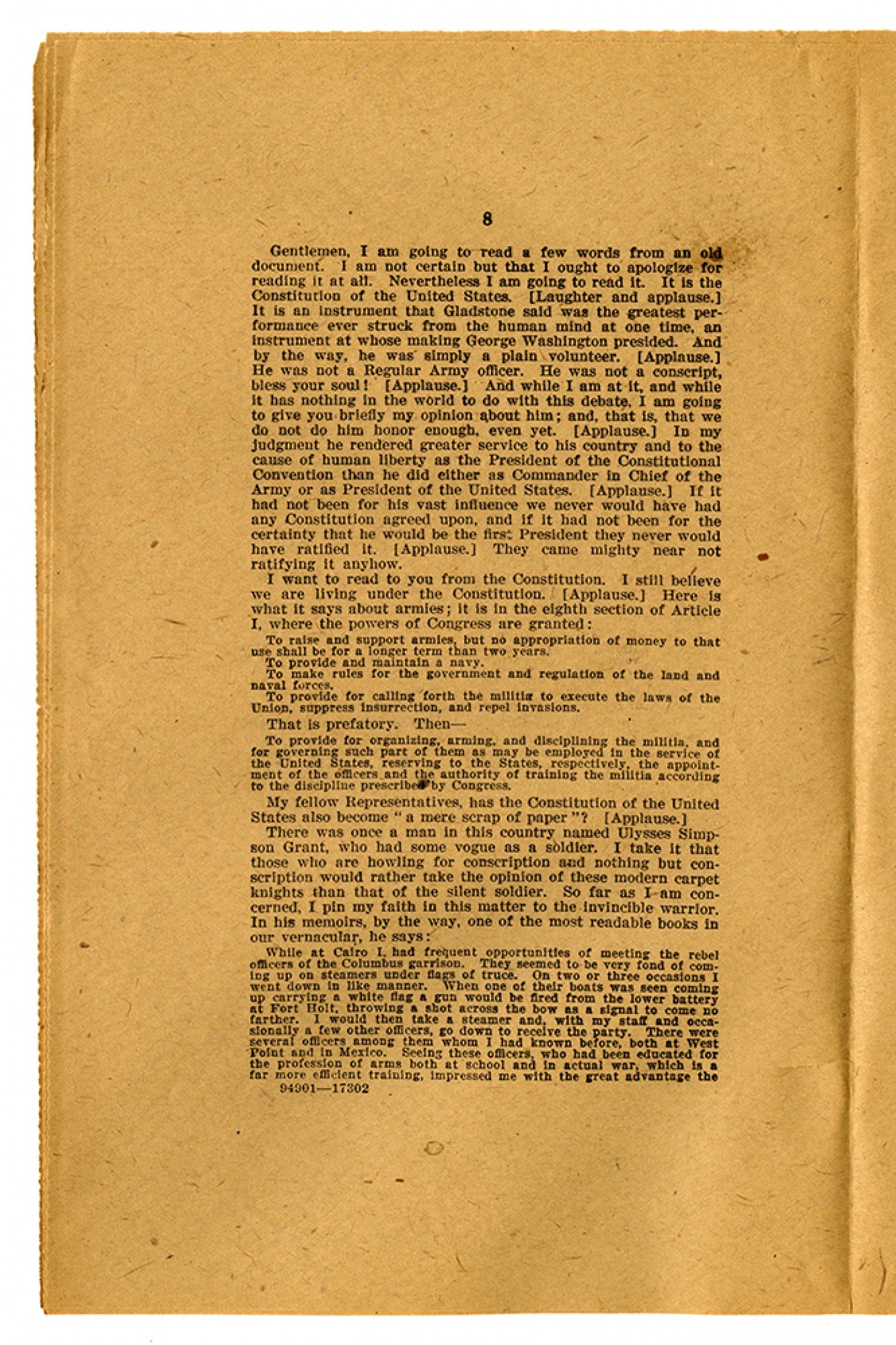 [page 8] Gentlemen, I am going to read a few words from an old document. I am not certain but that I ought to apologize for reading it at all. Nevertheless I am going to read it. It is the Constitution of the United States. (Laughter and applause.) It is an instrument that Gladstone said was the greatest performance ever struck from the human mind at one time, an instrument at whose making George Washington presided. And by the way, he was simply a plain volunteer. (Applause.) He was not a Regular Army officer. He was not a conscript, bless your soul! (Applause.) And while I am at it, and while it has nothing in the world to do with this debate, I am going to give you briefly my opinion about him; and, that is, that we do not do him honor enough, even yet. (Applause.) In my judgment he rendered greater service to his country and to the cause of human liberty as the President of the Constitutional Convention that he did either as Commander in Chief of the Army of as President of the United States. (Applause.) If it had not been his vast influence we never would have had any Constitution agreed upon, and if it had not been for the certainty that he would be the first President they never would have ratified it. (Applause.) They cam mighty near not ratifying it anyhow. I want to read to you from the Constitution. I still believe we are living under the Constitution. (Applause.) Here is what it says about armies; it is in the eighth section of Article I, where the powers of Congress are granted: To raise and support armies, but no appropriation of money to that use shall be for a longer term than two years. To provide and maintain a navy. To make rules for the government and regulation of the land and naval forces. To provide for calling forth the militia to execute the laws of the Union, suppress insurrection, and repel invasions. That is prefatory. Then - To provide for organizing, arming, and disciplining the militia, and for governing such part of them as may be employed in the service of the United States, reserving to the States, respectively, the appointment of the officers and the authority of training the militia according to the discipline prescribed by Congress. My fellow Representatives, has the Constitution of the United States also become “a mere scrap of paper”? (Applause.) There was once a man in this country named Ulysses Simpson Grant, who had some vogue as a soldier. I take it that those who are howling for conscription and nothing but conscription would rather take the opinion of those modern carpet knights than that of the silent soldier. So far as I am concerned, I pin my faith in this matter to the invincible warrior. In his memoirs, by the way, one of the most readable books in our vernacular, he says: While at Cairo I had frequent opportunities of meeting the rebel officers of the Columbus garrison. They seemed to be very fond of coming up on steamers under flags of truce. On two or three occasions I went down in like manner. When one of their boats was seen coming up carrying a white flag a gun would be fired from the lower battery at Fort Holt, throwing a shot across the boy as a signal to come no farther. I would then take a steamer and, with my staff and occasionally a few other officers, go down to receive the party. There were several officers among them whom I had known before, both at West Point and in Mexico. Seeing these officers, who had been educated for the profession of arms both at school and in actual war, which is a far more efficient training, impressed me with the great advantage the