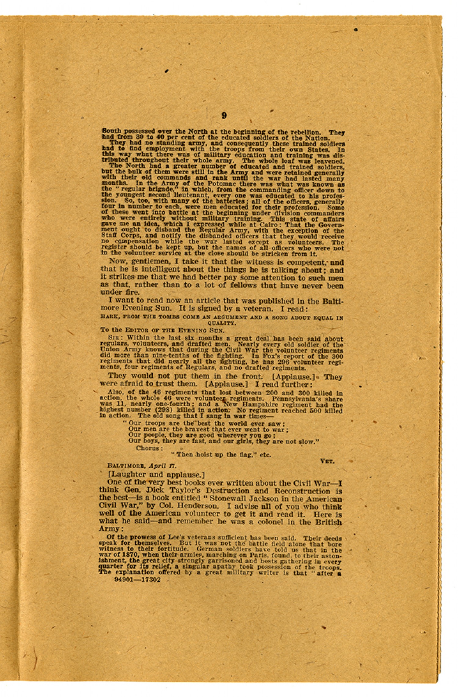 [page 9] South possessed over the North at the beginning of the rebellion. They had from 30 to 40 per cent of the educated soldiers of the Nation. They had no standing army, and consequently these trained soldiers had to find employment with the troops from their own States. In this way what there was of military education and training was distributed throughout their whole army. The whole loaf was leavened. The North had a greater number of educated and trained soldiers, but the bulk of them were still in the Army and were retained generally with their old commands and rank until the war had lasted many months. In the Army of the Potomac there was what was known as the “regular brigade,” in which, from the commanding officer down to the youngest second lieutenant, every one was educated to his profession. So, too, with many of the batteries; all of the officers, generally four in number to each, were men educated for their profession. Some of these went into battle at the beginning under division commanders who were entirely without training. This state of affairs gave me an idea, which I expressed while at Cairo: That the Government ought to disband the Regular Army, with the exception of the Staff Corps, and notify the disbanded officers that they would receive no compensation while the war lasted except as volunteers. The register should be kept up, but the names of all officers who were not in the volunteer service at the close should be stricken from it. No, gentlemen, I take it that the witness is competent, and that he is intelligent about the things he is talking about; and it strikes me that we had better pay some attention to such men as that, rather than to a lot of fellows that have never been under fire. I want to read now an article that was published in the Baltimore Evening Sun. It is signed by a veteran. I read: HARK, FROM THE TOMBS COME AN ARGUMENT AND A SONG ABOUT EQUAL IN QUALITY. TO THE EDITOR OF THE EVENING SUN. SIR: Within the last six months a great deal has been said about regulars, volunteers, and drafted men. Nearly every old soldier of the Union Army knows that during the Civil War the volunteer regiments did more than nine-tenths of the fighting. In Fox’s report of the 300 regiments that did nearly all the fighting, he has 296 volunteer regiments, four regiments of Regulars, and no drafted regiments. They would not push them in the front. (Applause.) They were afraid to trust them. (Applause.) I read further: Also, of the 46 regiments that lost between 200 and 300 killed in action, the whole 46 were volunteer regiments. Pennsylvania’s share was 11, nearly one-fourth; and a New Hampshire regiment had the highest number (298) killed in action. No regiment reached 500 killed in action. The old song that I sang in war times - “Our troops are the best the world ever saw; Our men are the bravest that ever went to war; Our people, they are good wherever you go; Our boys, they are fast, and our girls, they are not slow.” Chorus: “Then hoist up the flag,” etc. VET. Baltimore, April [1917] (Laughter and applause.) One of the very best books ever written about the Civil War - I think Gen. Dick Taylor’s Destruction and Reconstruction is the best - is a book entitled “Stonewall Jackson in the American Civil War,” by Col. Henderson. I advise all of you who think well of the American volunteer to get it and read it. Here is what he said - and remember he was a colonel in the British Army: Of the prowess of Lee’s veterans sufficient has been said. Their deeds speak for themselves. But it was not the battle field alone that bore witness to their fortitude. German soldiers have told us that in the war of 1870, when their armies, marching on Paris, found to their astonishment, the great city strongly garrisoned and hosts gathering in every quarter for its relief, a singular apathy took possession of the troops. The explanation offered by a great military writer is that “after a