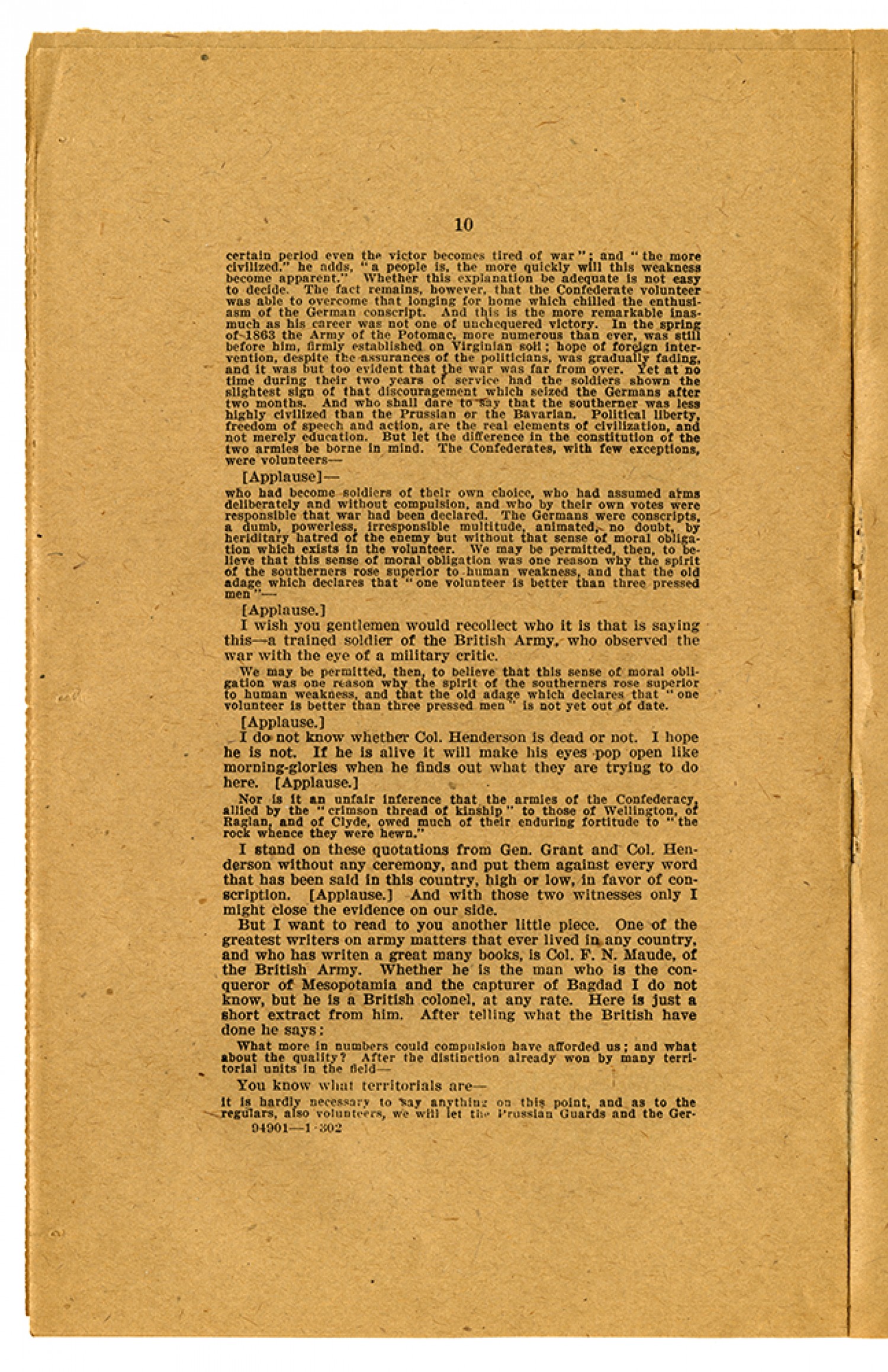 [page 10] certain period even the victor becomes tired of war “ ; and “the more civilized.” he adds, “a people is, the more quickly will this weakness become apparent.” Whether this explanation be adequate is not easy to decide. The fact remains, however, that the Confederate volunteer was able to overcome that longing for home which chilled the enthusiasm of the German conscript. And this is the more remarkable inasmuch as his career was not one of unchequered victory. In the spring of 1863 the Army of the Potomac, more numerous than ever, was still before him, firmly established on Virginian soil; hope of foreign intervention, despite the assurances of the politicians, was gradually fading, and it was but too evident that the war was far from over. Yet at no time during their two years of service had the soldiers shown the slightest sign of that discouragement which seized the Germans after two months. And who shall dare to say that the southerner was less highly civilized than the Prussian or the Bavarian. Political liberty, freedom of speech and action, are the real elements of civilization, and not merely education. But let the difference in the constitution of the two armies be borne in mind. The Confederates, with few exceptions, were volunteers - (Applause) - who had become soldiers of their own choice, who had assumed arms deliberately and without compulsion, and who by their own votes were responsible that war had been declared. The Germans were conscripts, a dumb, powerless, irresponsible multitude, animated, no doubt, by heriditary hatred of the enemy but without that sense of moral obligation which exists in the volunteer. We may be permitted, then, to believe that this sense of moral obligation was one reason why the spirit of the southerners rose superior to human weakness, and that the old adage which declares that “one volunteer is better than three pressed men” - (Applause.) I wish you gentlemen would recollect who it is that is saying this - a trained soldier of the British Army, who observed the war with the eye of a military critic. We may be permitted, then, to believe that this sense of moral obligation was one reason why the spirit of the southerners rose superior to human weakness, and that the old adage which declares that “one volunteer is better than three pressed men” is not yet out of date. (Applause.) I do not know whether Col. Henderson is dead or not. I hope he is not. If he is alive it will make his eyes pop open like morning-glories when he finds out what they are trying to do here. (Applause.) Nor is it an unfair inference that the armies of the Confederacy, allied by the “crimson thread of kinship” to those of Wellington, of Raglan, and of Clyde, owed much of their enduring fortitude to “the rock whence they were hewn.” I stand on these quotations from Gen. Grand and Col. Henderson without any ceremony, and put them against every word that has been said in this country, high or low, in favor of conscription. (Applause.) And with those two witnesses only I might close the evidence on our side. But I want to read to you another little piece. One of the greatest writers on army matters that ever lived in any country, and who has written a great many books, is Col. F. N. Maude, of the British Army. Whether he is the man who is conqueror of Mesopotamia and the capturer of Bagdad I do not know, but he is a British Colonel, at any rate. Here is just a short extract from him. After telling what the British have done he says: What more in numbers could compulsion afforded us; and what about the quality? After the distinction already won by many territorial units in the field - You know what territorials are - it is hardly necessary to say anything on this point, and as to the regulars, also volunteers, we will let the Prussian Guards and the Ger-