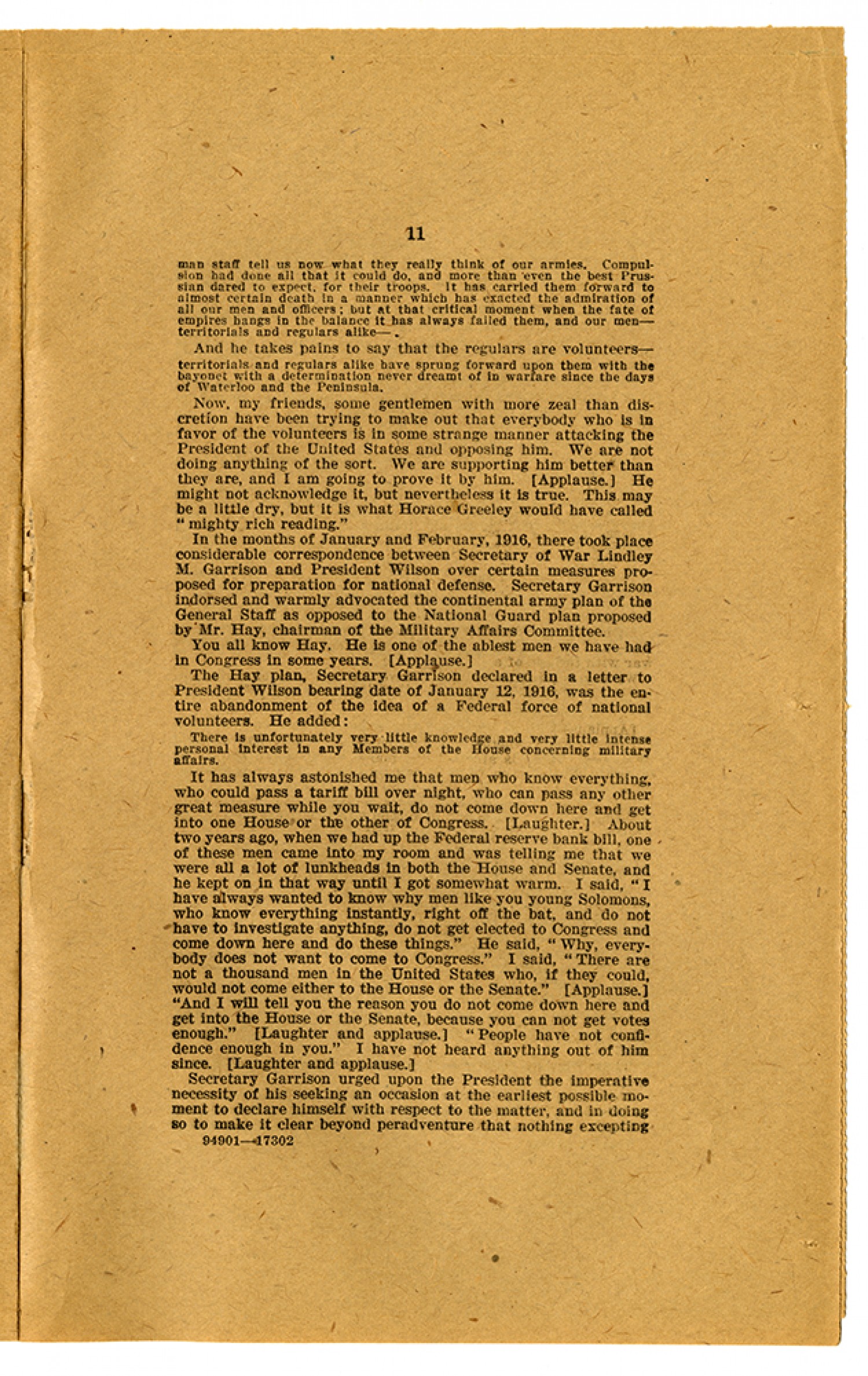 [page 11] man staff tell us now what they really think of our armies. Compulsion had done all that it could do, and more than even the best Prussian dared to expect for their troops. It has carried them forward to almost certain death in a manner which has exacted the admiration of all our men and officers; but at that critical moment when the fate of empires hangs in the balance it has always failed them, and our men - territorials and regulars alike - And he takes pains to say that the regulars are volunteers - territorials and regulars alike have sprung forward upon them with the bayonet with a determination never dreamt of in warfare since the days of Waterloo and the Peninsula. Now, my friends, some gentlemen with more zeal than discretion have been trying to make out that everybody who is in favor of the volunteers is in some strange manner attacking the President of the United States and opposing him. We are not doing anything of the sort. We are supporting him better than they are, and I am going to prove it by him. (Applause.) He might not acknowledge it, but nevertheless it is true. This may be a little dry, but it is what Horace Greeley would have called “mighty rich reading.” In the months of January and February, 1916, there took place considerable correspondence between Secretary of War Lindley M. Garrison and President Wilson over certain measures proposed for preparation for national defense. Secretary Garrison indorsed and warmly advocated the continental army plan of the General Staff as opposed to the National Guard plan proposed by Mr. Hay, chairman of the Military Affairs Committee. You all know Hay. He is one of the ablest men we have had in Congress in some years. (Applause.) The Hay plan, Secretary Garrison declared in a letter to President Wilson bearing date of January 12, 1916, was the entire abandonment of the idea of a Federal force of national volunteers He added: There is unfortunately very little knowledge and very little intense personal interest personal interest in any Members of the House concerning military affairs. It has always astonished me that men who know everything, who could pass a tariff bill over night, who can pass any other great measure while you wait, do not come down here and get into one House or the other of Congress. (Laughter.) About two years ago, when we had up the Federal reserve bank bill, one of these men came into my room and was telling me that we were all a lot of lunkheads in both the House and Senate, and he kept on in that way until I got somewhat warm. I said, “I have always wanted to know why men like you young Solomons, who know everything instantly, right off the bat, and do not have to investigate anything, do not get elected to Congress and come down here and do these things.” He said, “Why, everybody does not want to come to Congress.” I said, “There are not a thousand men in the United States who, if they could, would not come either to the House or the Senate.” (Applause.) “And I will tell you the reason you do not come down here and get into the House or the Senate, because you can not get the votes enough.” (Laughter and applause.) “People have not confidence enough in you.” I have not heard anything out of him since. (Laughter and applause.) Secretary Garrison urged upon the President the imperative necessity of his seeking an occasion at the earliest possible moment to declare himself with respect to the matter, and in doing so to make it clear beyond peradventure that nothing excepting