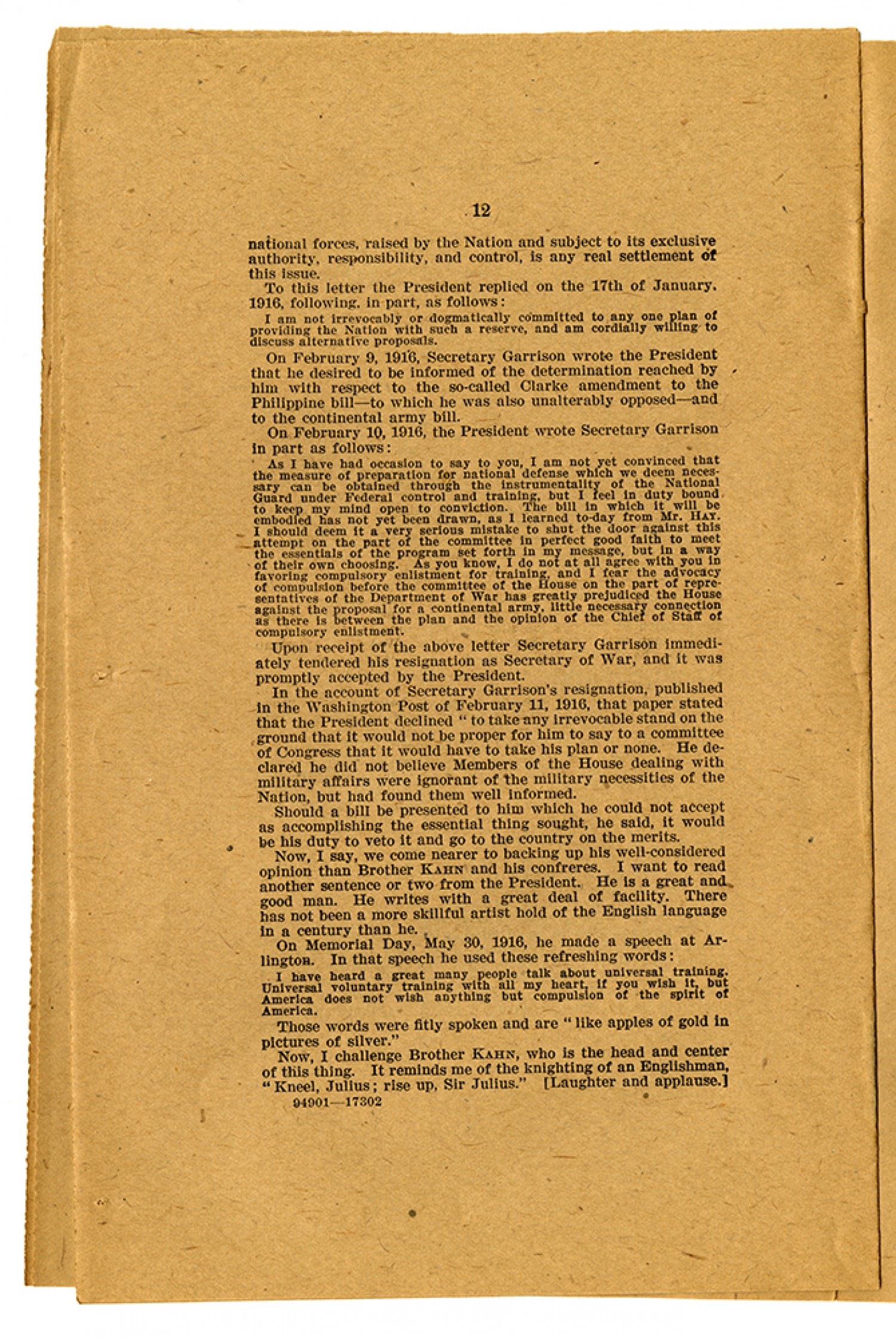 [page 12] national forces, raised by the Nation and subject to its exclusive authority, responsibility, and control, is any real settlement of this issue. To this letter the President replied on the 17th of January, 1916, following, in part, as follows: I am not irrevocably or dogmatically committed to any one plan of providing the Nation with such a reserve, and am cordially willing to discuss alternative proposals. On February 9, 1916, Secretary Garrison wrote the President that he desired to be informed of the determination reached by him with respect to the so-called Clarke amendment to the Philippine bill - to which he was also unalterably opposed - and to the continental army bill. On February 10, 1916, the President wrote Secretary Garrison in part as follows: As I have had occasion to say to you, I am not yet convinced that the measure of preparation for national defense which we deem necessary can be obtained through the instrumentality of the National Guard under Federal control and training, but I feel in duty bound to keep my mind open to conviction. The bill in which it will be embodied has not yet been drawn, as I learned to-day from Mr. HAY. I should deem it a very serious mistake to shut the door against this attempt on the part of the committee in perfect good faith to meet the essentials of the program set forth in my message, but in a way of their own choosing. As you know, I do not agree with you in favoring compulsory enlistment for training, and I fear the advocacy of compulsion before the committee of the House on the part of representatives of the Department of War has greatly prejudiced the House against the proposal for a continental army, little necessary connection as there is between the plan and the opinion of the Chief of Staff of compulsory enlistment. Upon receipt of the above letter Secretary Garrison immediately tendered his resignation as Secretary of War, and it was promptly accepted by the President. In the account of Secretary Garrison’s resignation, published in the Washington Post of February 11, 1916, that paper stated that the President declined “to take any irrevocable stand on the ground that it would not be proper for him to say to a committee of Congress that it would have to take his plan or none. He declared he did not believe Members of the House dealing with military affairs were ignorant of the military necessities of the Nation, but had found them well informed. Should a bill be presented to him which he could not accept as accomplishing the essential thing sought, he said, it would be his duty to veto it and go to the country on the merits. Now, I say, we come nearer to backing up his well-considered opinion than Brother KAHN and his confreres. I want to read another sentence or two from the President. He is a great and good man. He writes with a great deal of facility. There has not been a more skillful artist hold of the English language in a century than he. On Memorial Day, May 30, 1916, he made a speech at Arlington. In that speech he used these refreshing words: I have heard a great many people talk about universal training, Universal voluntary training with all my heart, if you wish it, but America does not wish anything but compulsion of the spirit of America. Those words were fitly spoken and are “like apples of gold in pictures of silver.” Now, I challenge Brother KAHN, who is the head and center of this thing. It reminds me of the knighting of an Englishman, “Kneel, Julius; rise up, Sir Julius.” (Laughter and applause.)