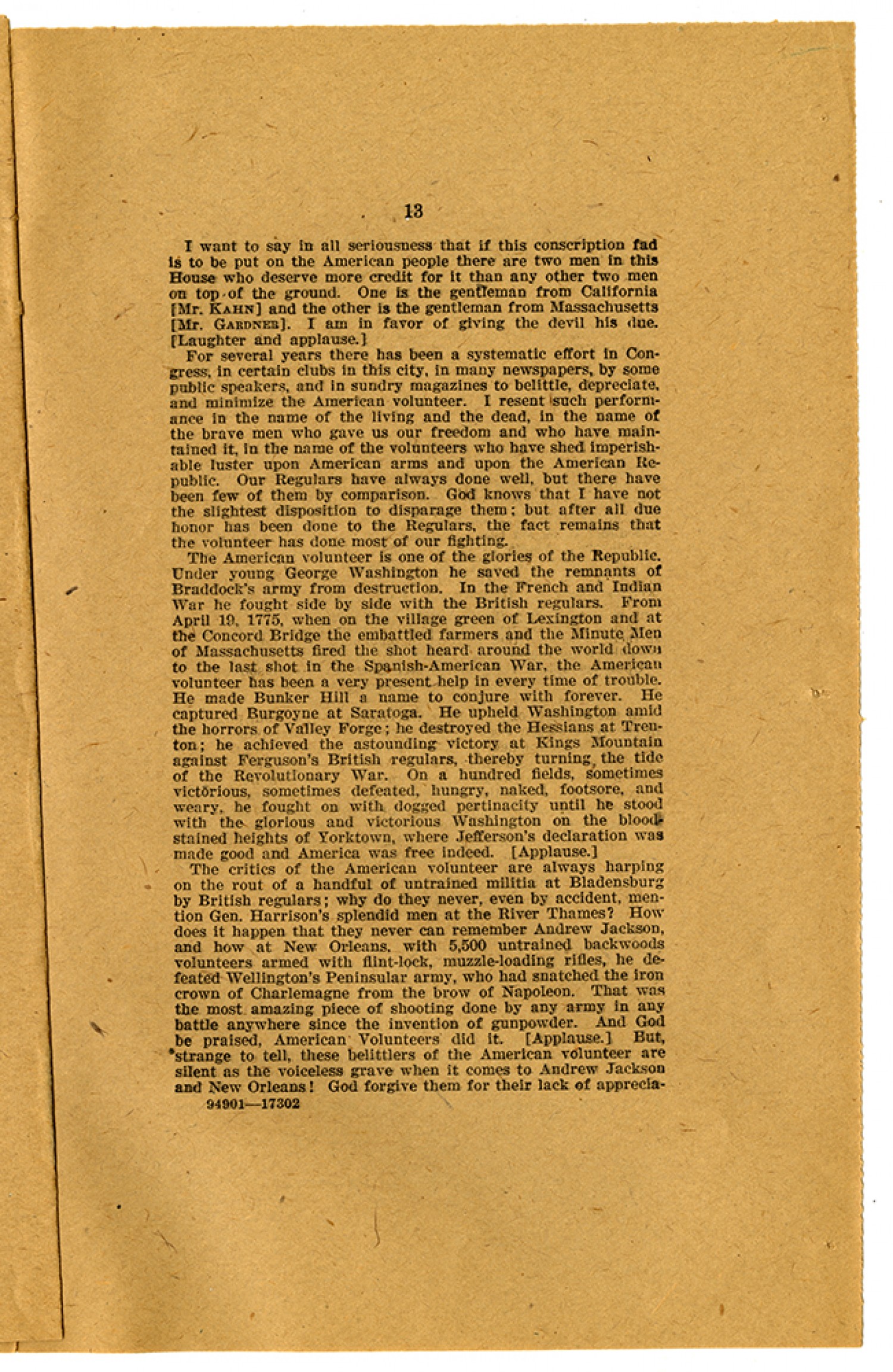 [page 13] I want to say in all seriousness that if this conscription fad is to be put on the American people there are two men in this House who deserve more credit for it than any other two men on top of the ground. One is the gentleman from California (Mr. KAHN) and the other is the gentleman from Massachusetts (Mr. GARDNER). I am in favor of giving the devil his due. (Laughter and applause.) For several years there has been a systematic effort in Congress, in certain clubs in this city, in newspapers, by some public speakers, and in sundry magazines to belittle, depreciate, and minimize the American volunteer. I resent such performance in the name of the living and the dead, in the name of the brave men who gave us our freedom and who have maintained it, in the name of the volunteers who have shed imperishable luster upon American arms and upon the American Republic. Our Regulars have always done well, but there have been few of them by comparison. God knows that I have not the slightest disposition to disparage them; but after all due honor has been done to the Regulars, the fact remains that the volunteer has done most of our fighting. The American volunteer is one of the glories of the Republic. Under young George Washington he saved the remnants of Braddock’s army from destruction. In the French and Indian War he fought side by side with the British regulars. From April 19, 1775, when on the village green of Lexington and at the Concord Bridge the embattled farmers and the Minute Men of Massachusetts fired the shot heard around the world down to the last shot in the Spanish-American War, the American volunteer has been a very present help in every time of trouble. He made Bunker Hill a name to conjure with forever. He captured Burgoyne at Saratoga. He upheld Washington amid the horrors of Valley Forge; he destroyed the Hessians at Trenton; he achieved the astounding victory at Kings Mountain against Ferguson’s British regulars, thereby turning the tide of the Revolutionary War. On a hundred fields, sometimes victorious, sometimes defeated, hungry, naked, footsore, and weary, he fought on with dogged pertinacity until he stood with the glorious and victorious Washington on the bloodstained heights of Yorktown, where Jefferson’s declaration was made good and America was free indeed. (Applause.) The critics of the American volunteer are always harping on the rout of a handful of untrained militia at Bladensburg by British regulars; why do they never, even by accident, mention Gen. Harrisons’ splendid men at the River Thames? How does it happen that they never can remember Andrew Jackson, and how at New Orleans, with 5,500 untrained backwoods volunteers armed with flint-lock, muzzle-loading rifles, he defeated Wellington’s Peninsular army, who had snatched the iron crown of Charlemagne from the brow of Napoleon. That was the most amazing peace of shooting done by any army in any battle anywhere since the invention of gunpowder. And God be praised, American Volunteers did it. (Applause.) But, strange to tell, these belittlers of the American volunteer are silent as the voiceless grave when it comes to Andrew Jackson and New Orleans! God forgive them for their lack of apprecia-