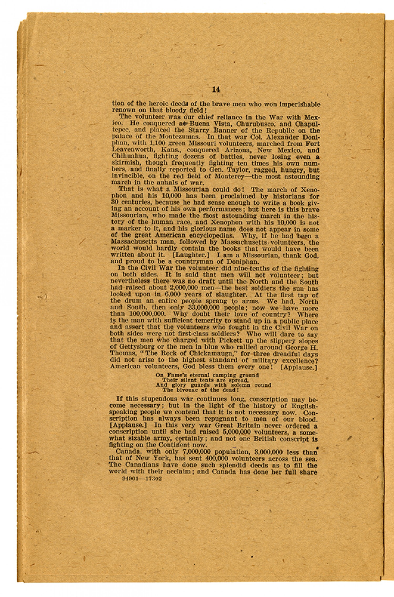 [page 14] tion of the heroic deeds of the brave men who won imperishable renown on that bloody field! The volunteer was our chief reliance in the War with Mexico. He conquered at Buena Vista, Churubusco, and Chapultepec, and placed the Starry Banner of the Republic on the palace of the Montezumas. In that war Col. Alexander Doniphan, with 1,100 green Missouri volunteers, marched from Fort Leavenworth, [Kansas], conquered Arizona, New Mexico, and Chihuahua, fighting dozens of battles, never losing even a skirmish, though frequently fighting ten times his own numbers, and finally reported to Gen. Taylor, ragged, hungry, but invincible, on the red field of Monterey - the most astounding march in the annals of war. That is what a Missourian would do! The march of Xenophon and his 10,000 has been proclaimed by historians for 30 centuries, because he had sense enough to write a book giving an account of his own performances; but here is this brave Missourian, who made the most astounding march in the history of the human race, and Xenophon with his 10,000 is not a marker to it, and his glorious name does not appear in some of the great American encyclopedias. Why, if he had been a Massachusetts man, followed by Massachusetts volunteers, the world would hardly contain the books that would have been written about it. (Laughter.) I am a Missourian, thank God, and proud to be a countryman of Doniphan. In the Civil War the volunteer did nine-tenths of the fighting on both sides. It is said that men will not volunteer; but nevertheless there was no draft until the North and the South had raised about 2,000,000 men - the best soldiers the sun has looked upon in 6,000 years of slaughter. At the first tap of the drum an entire people sprang to arms. We had, North and South, then only 33,000,000 people; now we have more than 100,000,000. Why doubt their love of country? Where is the man with sufficient temerity to stand up in a public place and assert that the volunteers who fought in the Civil War on both sides were not first-class soldiers? Who will dare to say that the men who charged with Pickett up the slippery slopes of Gettysburg or the men in blue who rallied around George H. Thomas, “The Rock of Chickamauga,” for three dreadful days did not arise to the highest standard of military excellence? American volunteers, God bless them every one! (Applause.) On Fame’s eternal camping ground Their silent tents are spread, And glory guards with solemn round The bivouac of the dead! If this stupendous war continues long, conscription may become necessary; but in the light of the history of English speaking people we contend that it is not necessary now. Conscription has always been repugnant to men of our blood. (Applause.) In this very war Great Britain never ordered a conscription until she had raised 5,000,000 volunteers, a somwhat sizable army, certainly; and not one British conscript is fighting on the Continent now. Canada, with only 7,000,000 population, 3,000,000 less than that of New York, has sent 400,000 volunteers across the sea. The Canadians have done such splendid deeds as to fill the world with their acclaim; and Canada has done her full share